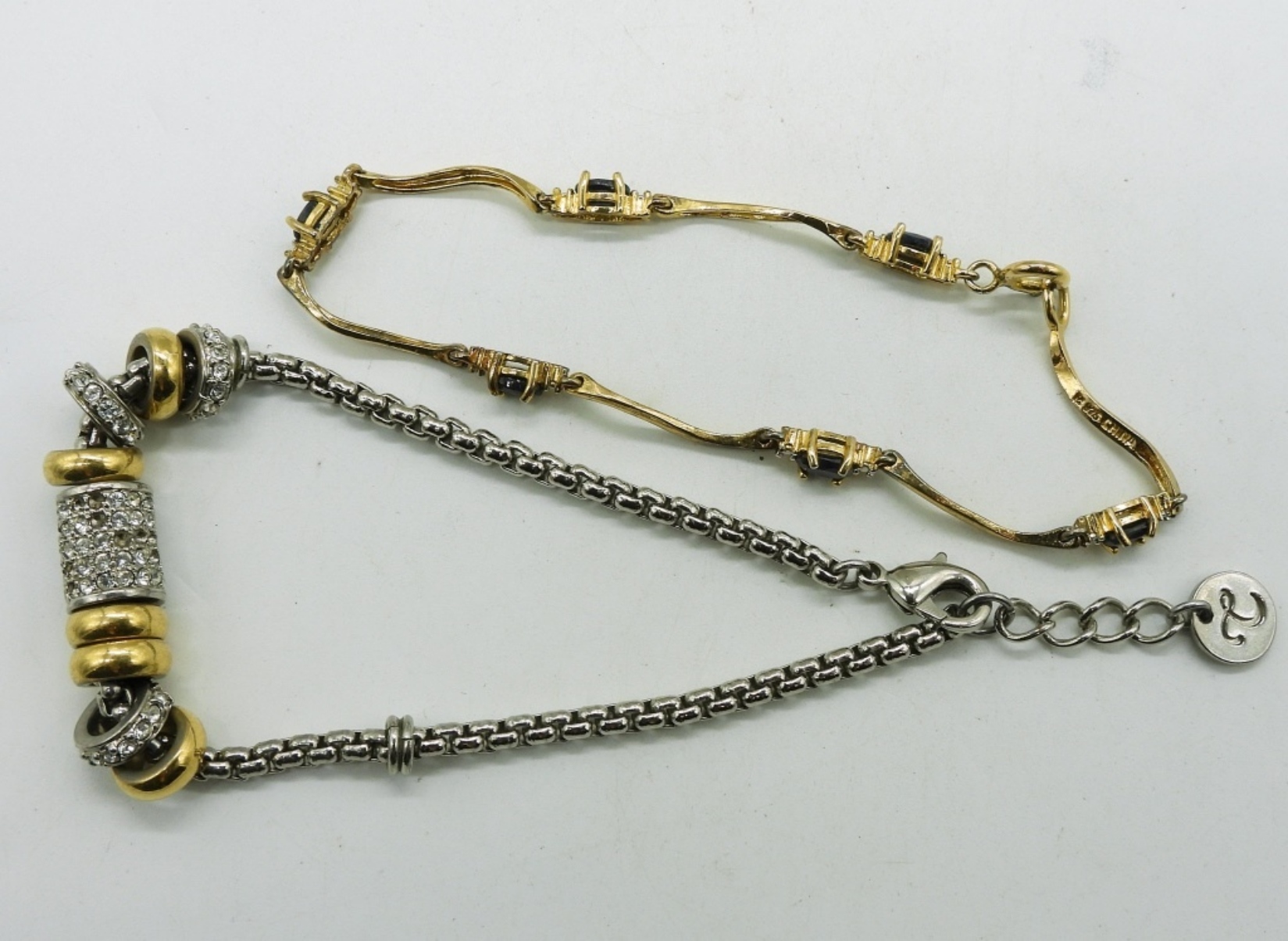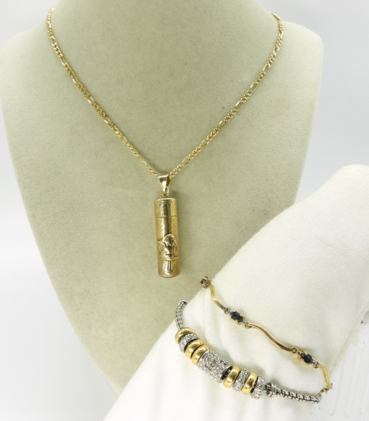 Two gold tone sterling bracelets, 7-8″ long. Sterling gold tone chain, 18″ with a gold tone 925 angel pendant that opens (tested as sterling). (20.2 dwt)