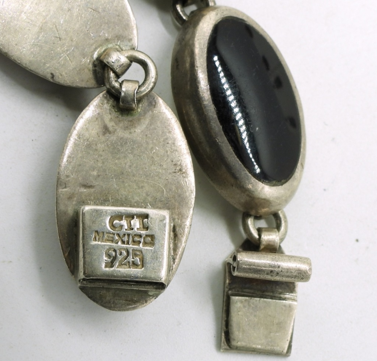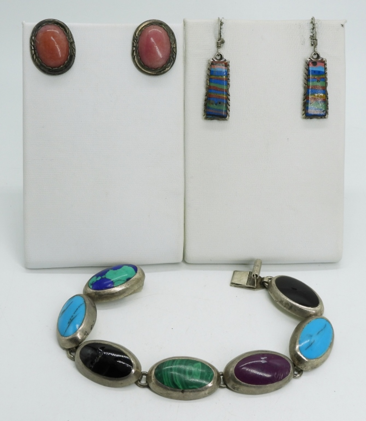 CII Mexico Sterling Bracelet with gemstones. One gemstone is missing a chunk, 7.5″. Two pair of sterling pierced earrings. (27.8 dwt)