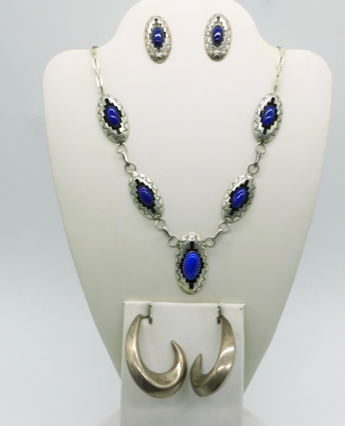 Matching necklace & pierced earrings, Sterling with Lapis Lazuli gemstones. Necklace is 18″ long. Matching pierced earring studs. Other pair of sterling pierced earrings, 1.5″ long. (24 dwt)