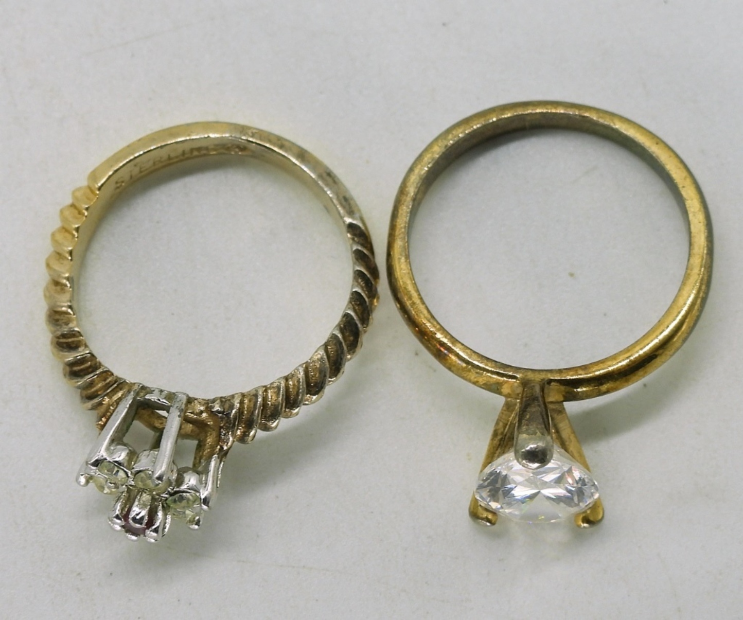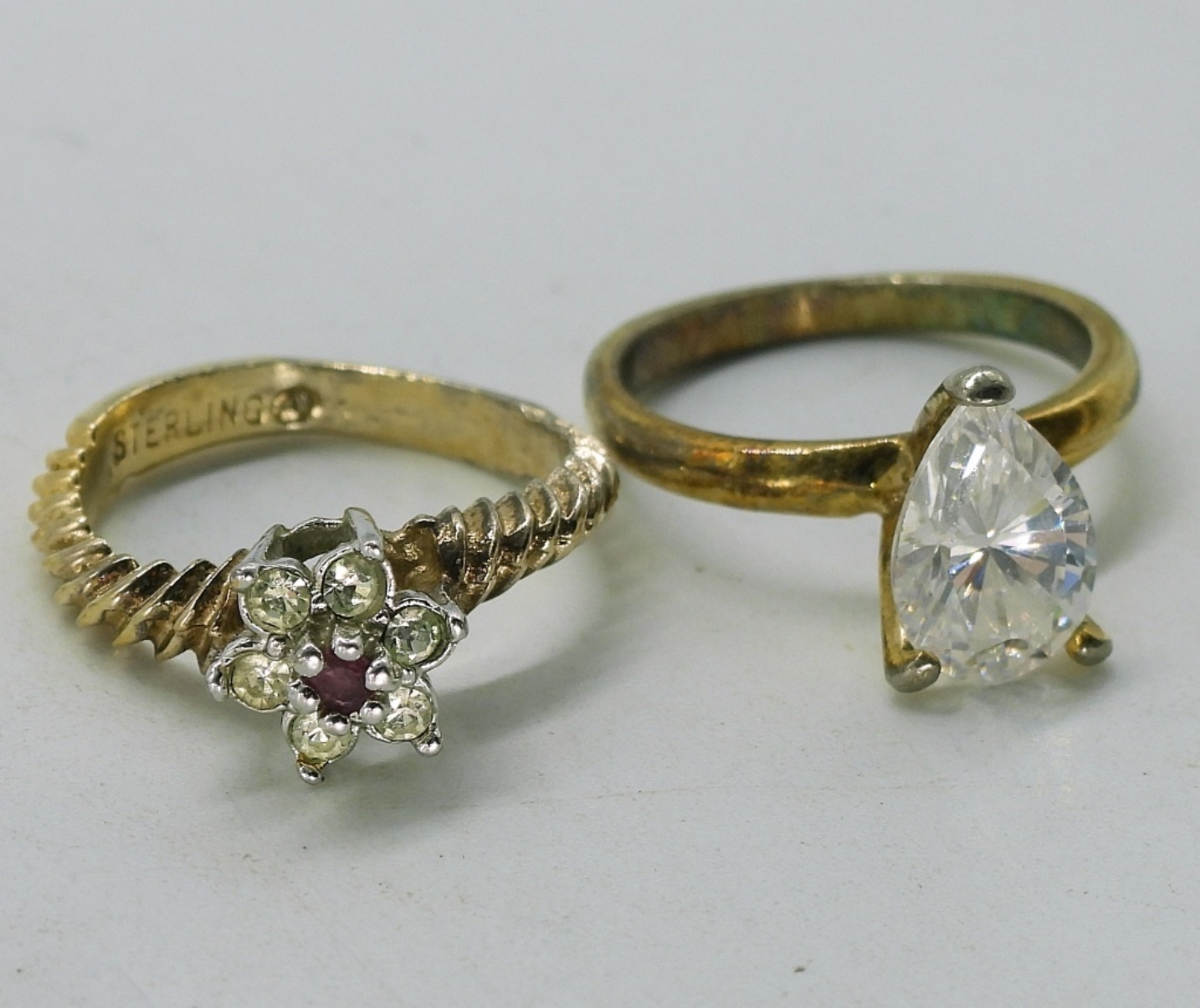 Gold Tone Sterling, Two rings, size 5. Amethyst pierced earrings. Bracelet, 9″. (34.1 dwt)