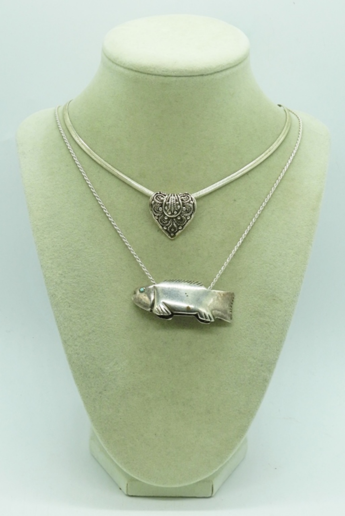 April Ernst, signed inside. Fish pendant on a sterling chain. 2″ wide, 22″ chain. Heart necklace is 20″. (24.7 dwt)