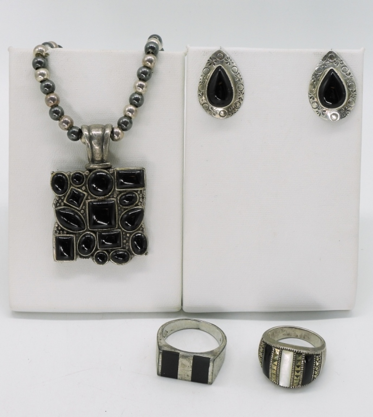 Two sterling rings with black onyx, sizes 7 & 9.5. Pierced black onyx earrings. Black onyx sterling pendant, 2″ long. On a sterling and hematite beaded necklace, 18″. (28 dwt) 6x4x2