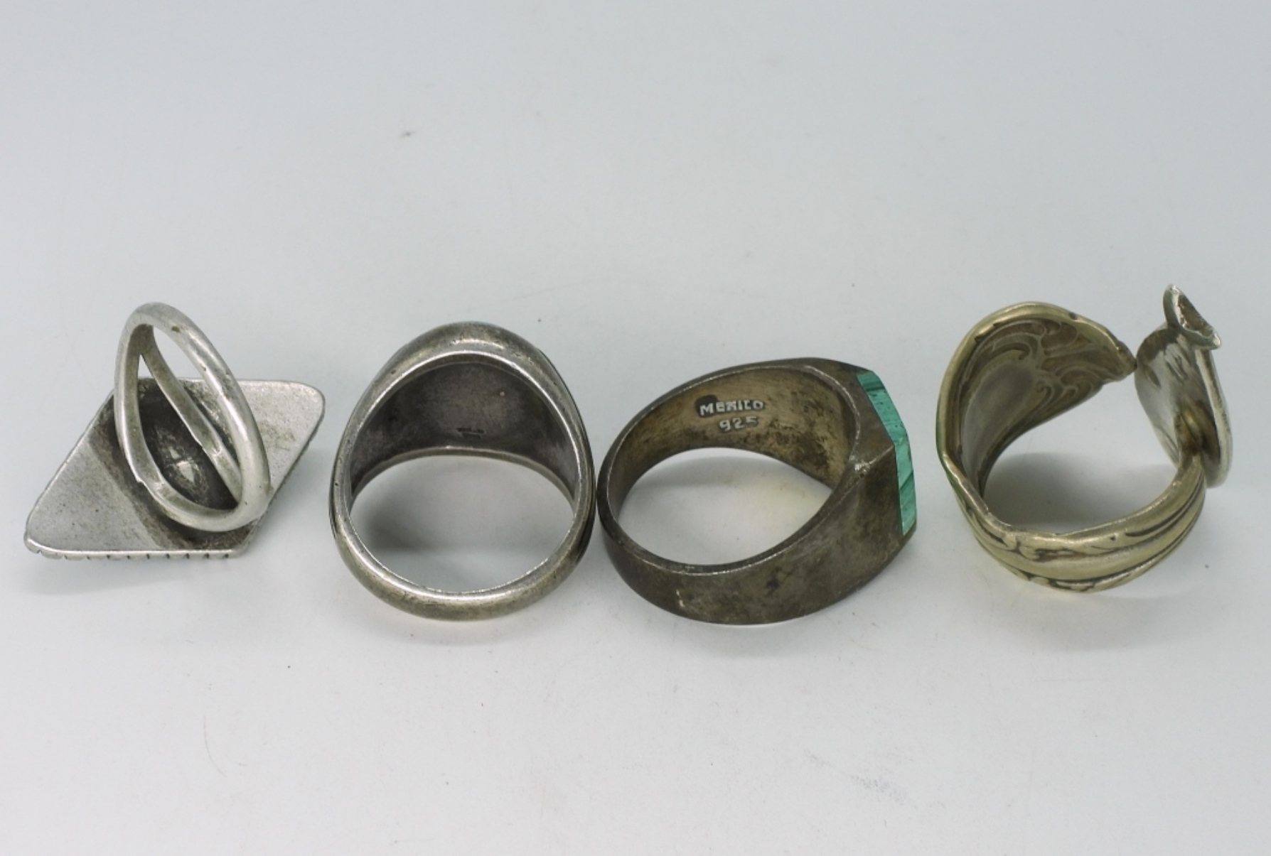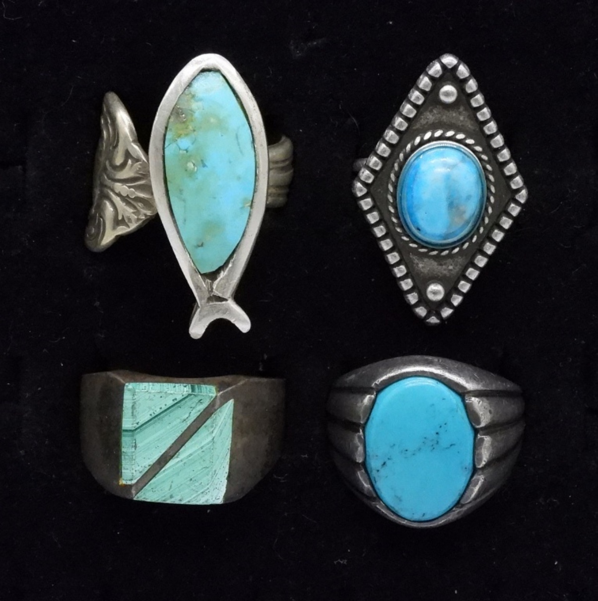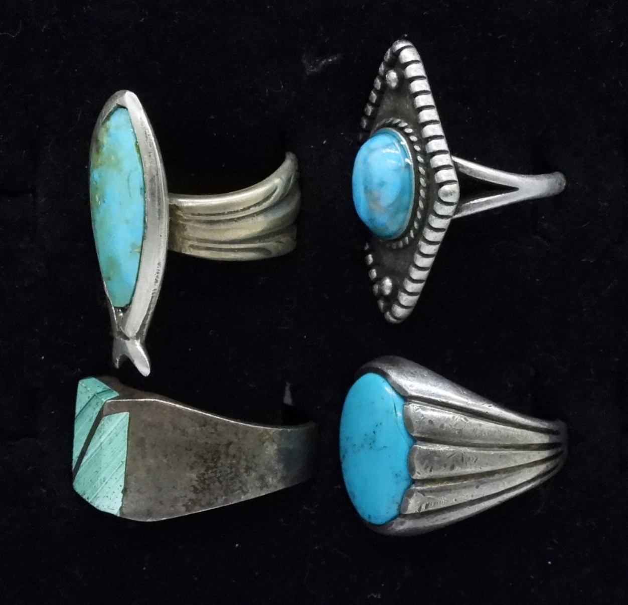 Four vintage sterling rings with turquoise gemstones. Sizes 8, 9, 10, 13. (31 dwt) 6x4x2