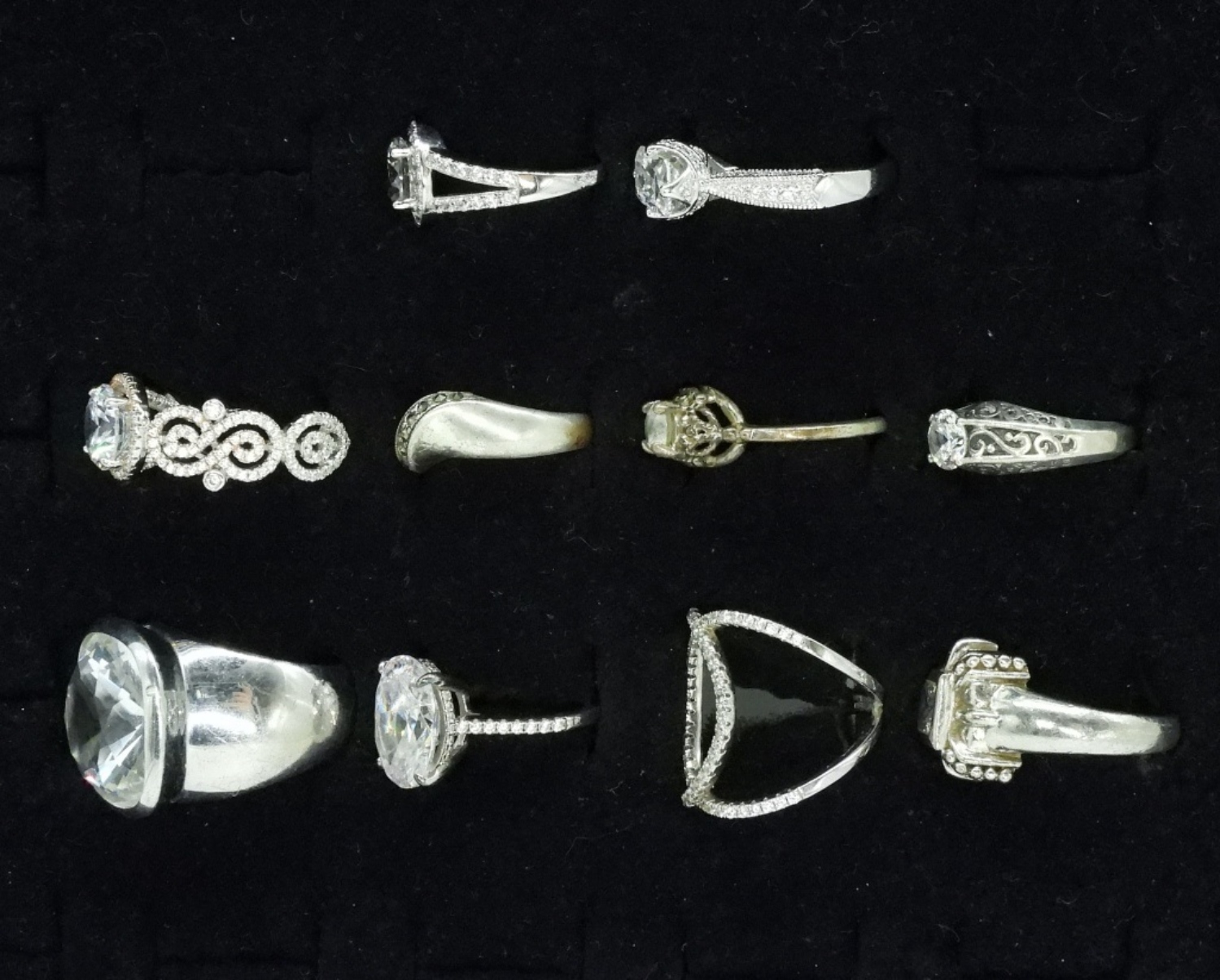 Ten sterling bridal style rings, simulated diamonds. Sizes 5.5 – 9. (36 dwt) 6x4x2