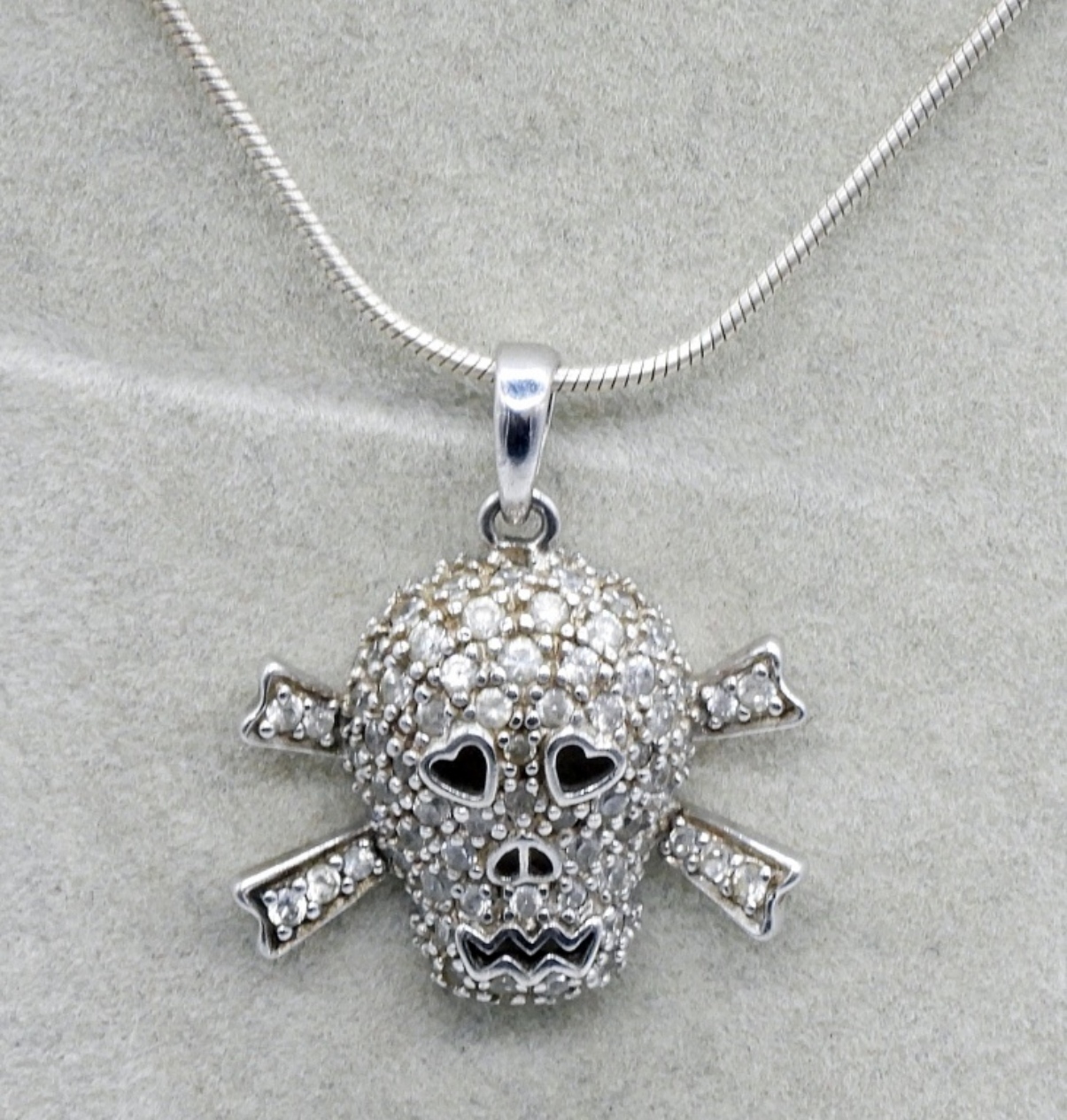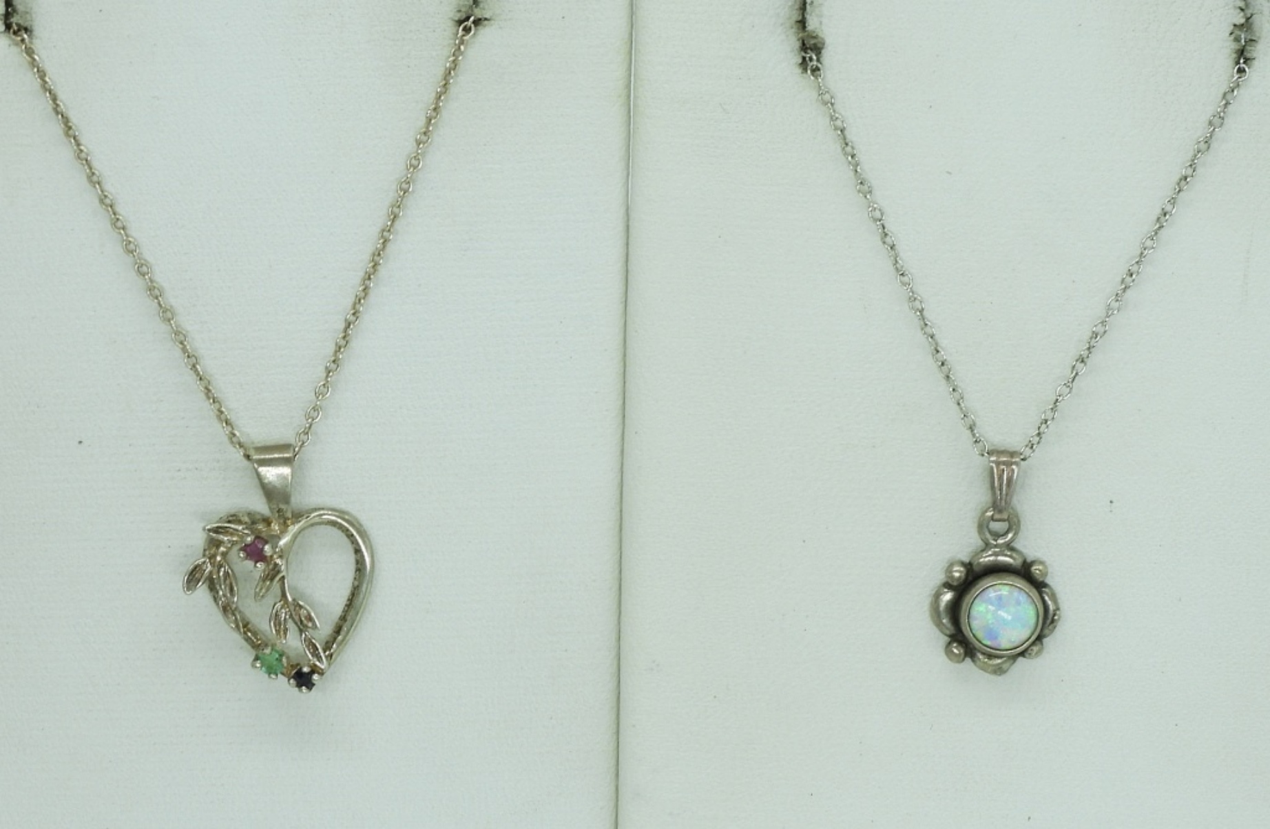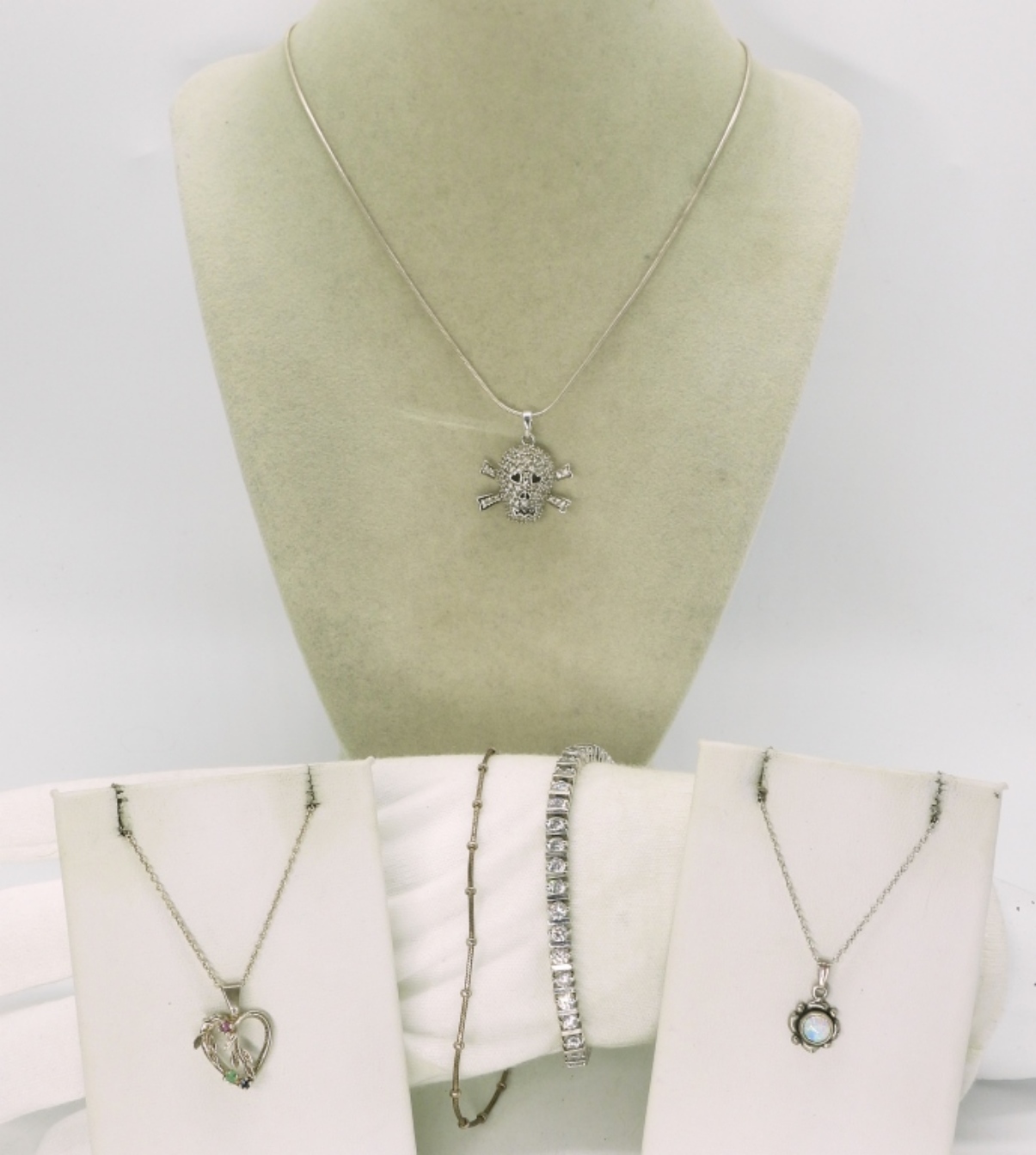 Three sterling fashion necklaces, 16-18″ sterling chains. Sterling tennis bracelet, simulated diamonds, 7″. Sterling anklet, 9″. (20 dwt)