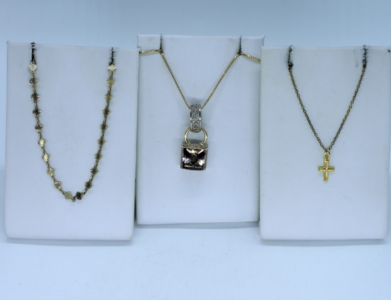 Petite gold tone sterling “Miranda Frye” choker necklace, 14″. Gold tone 925 cross necklace, 18″. Smokey Quartz sterling and gold tone pendant on a 18″ gold tone chain. (9.1 dwt) 6x4x2