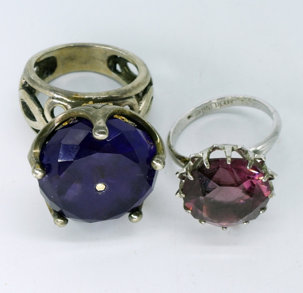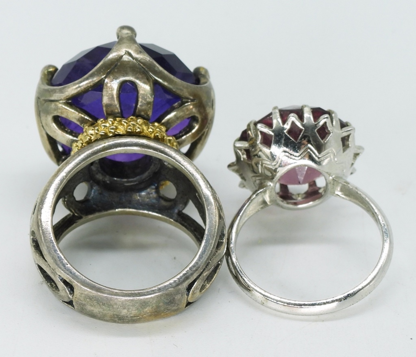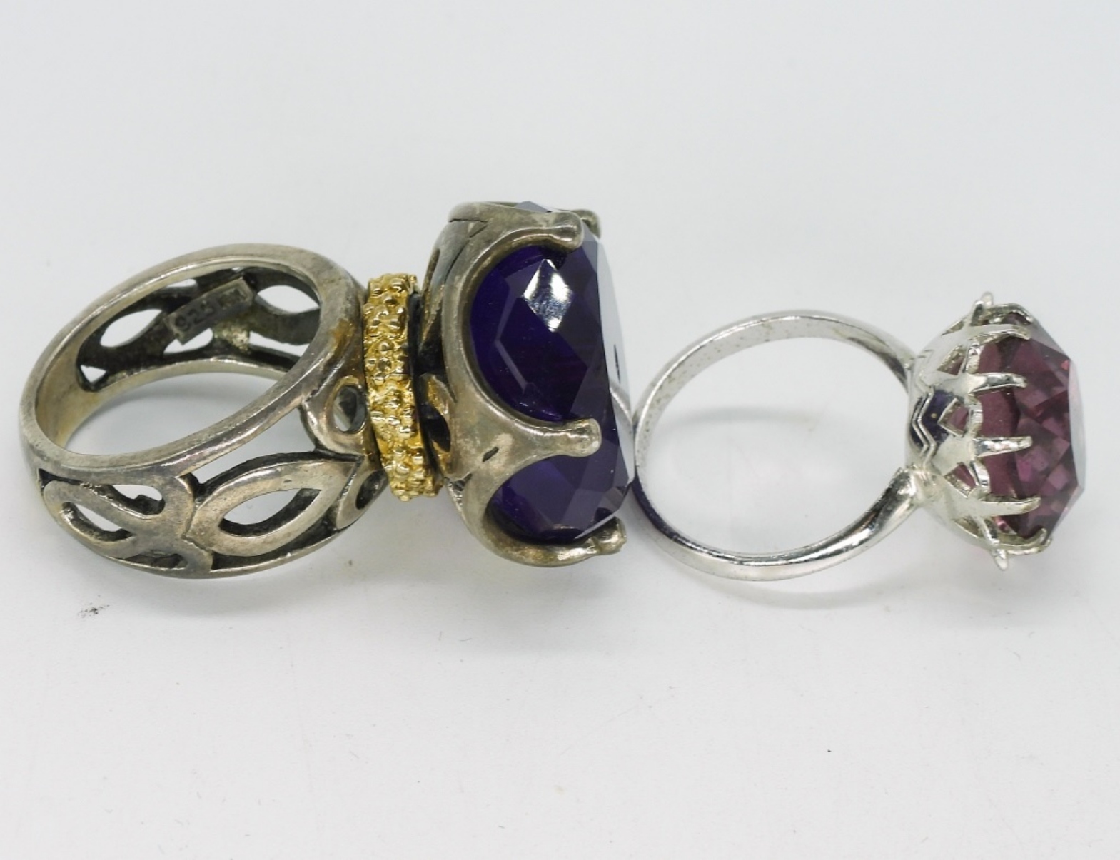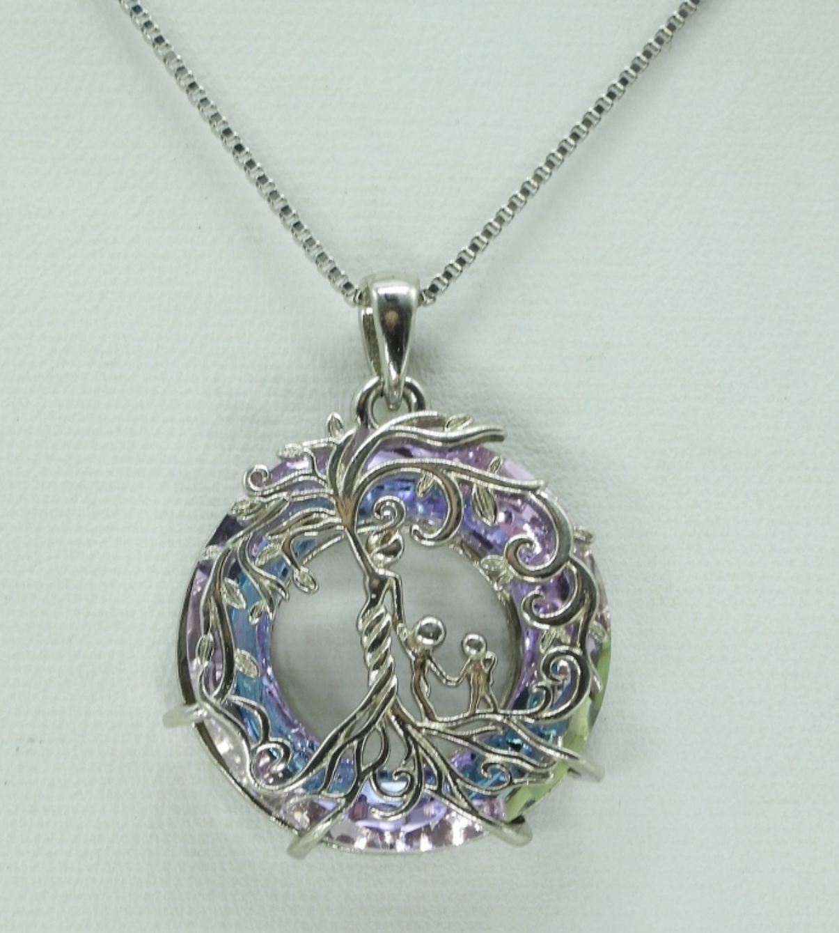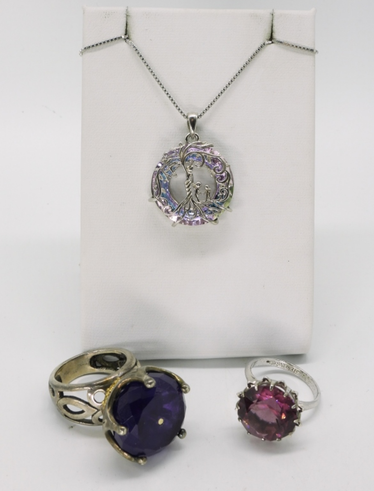 Two sterling rings with beautiful purple gemstones, sizes 6.5 & 7. The dark purple stone measures 1″ at the top. Mother and children purple sterling tree pendant on a 22″ chain. (20 dwt)6x4x2