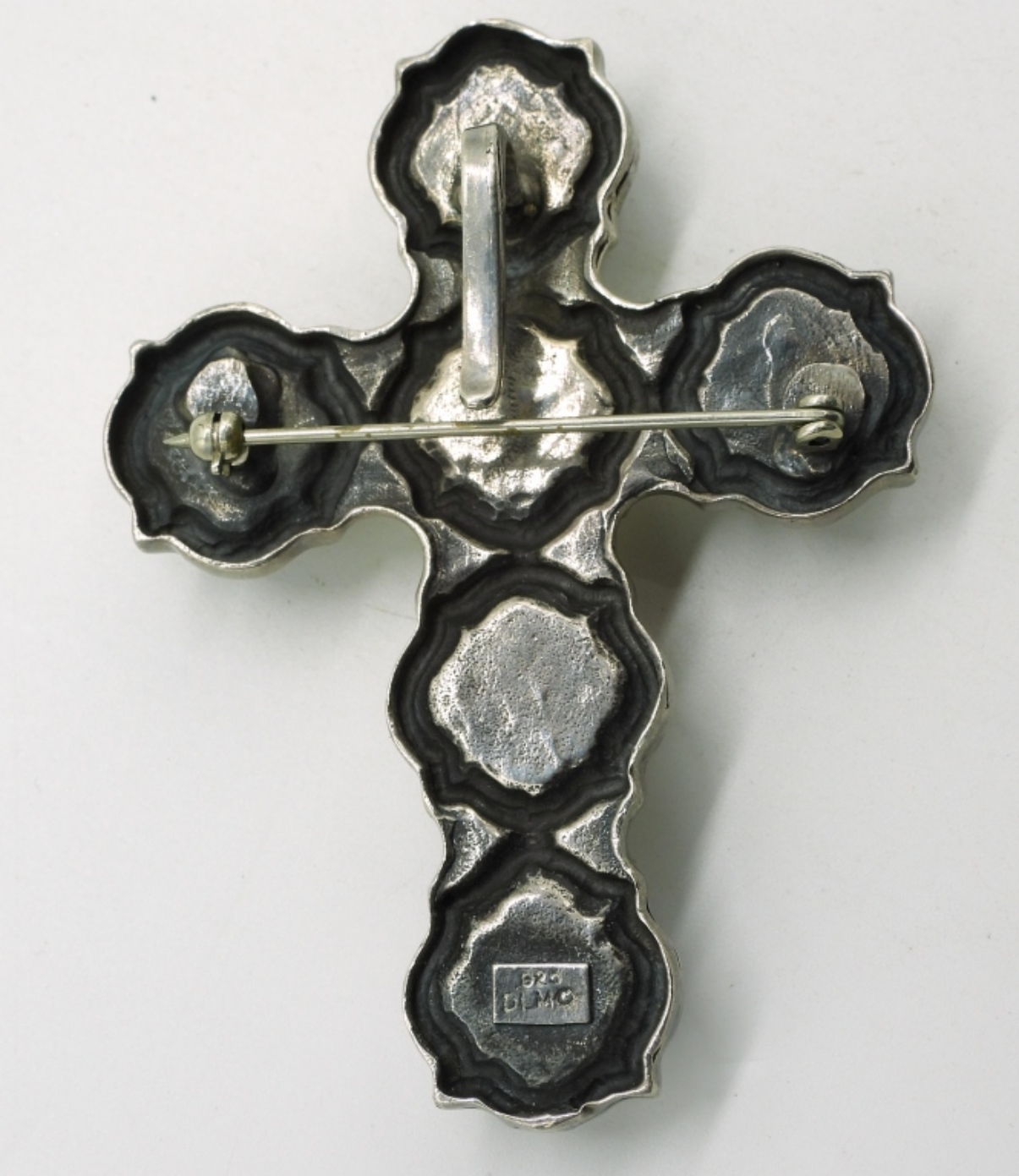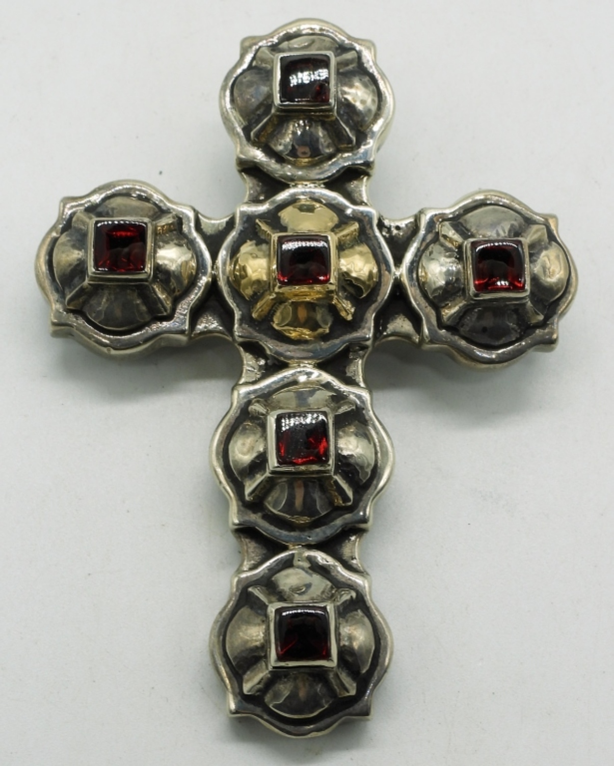 Large sterling cross pin / pendant with garnet gemstones. 3″ long, 2″ wide. (28.7 dwt)