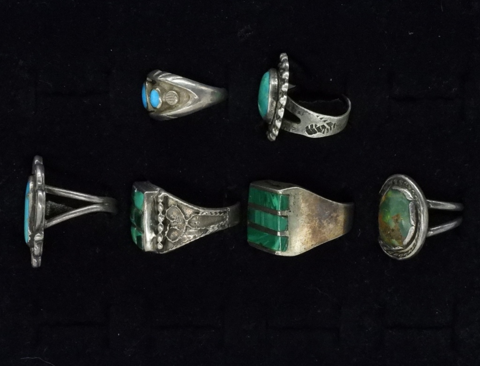 Five sterling vintage rings, malachite and turquoise gemstones. Sizes 5-11.5 (31 dwt)