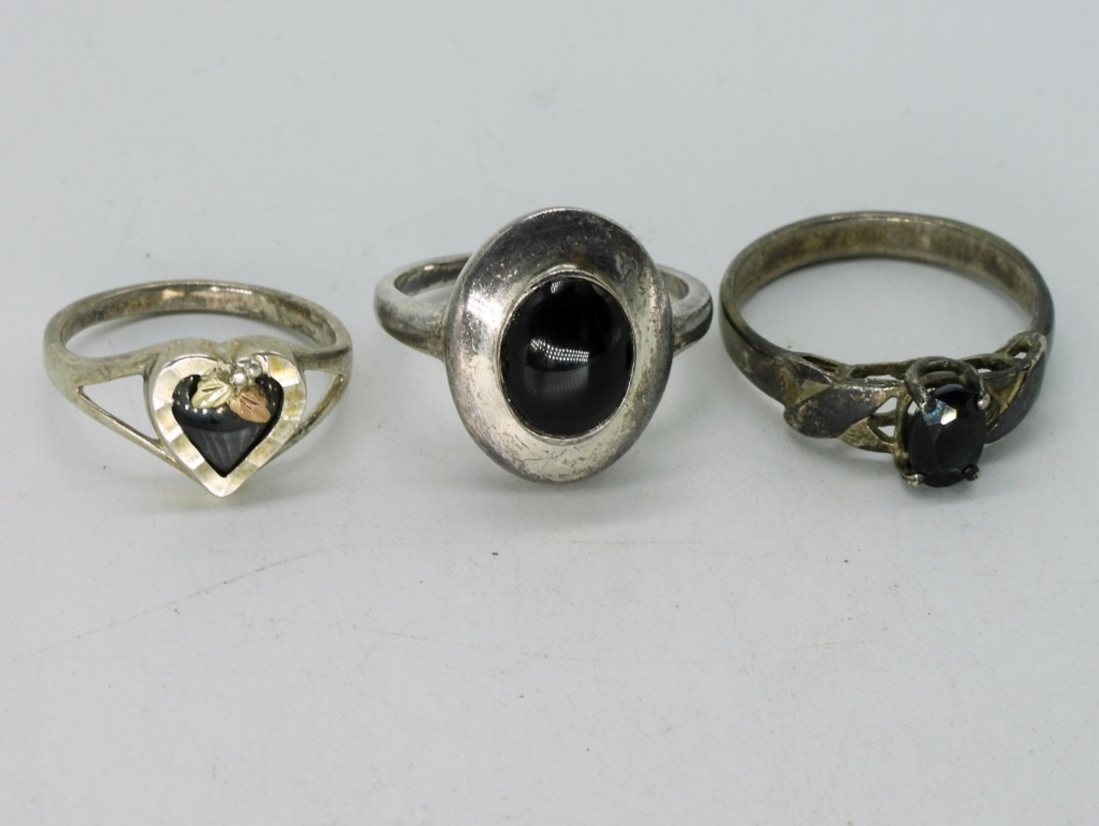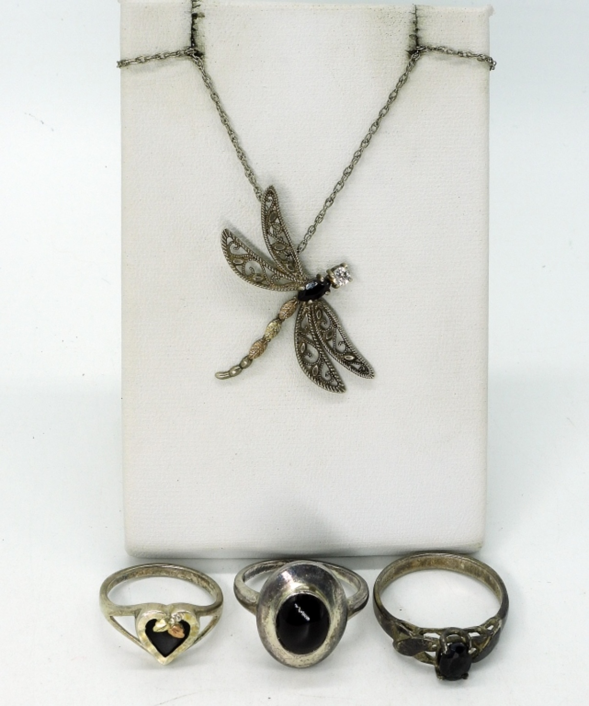 Vintage sterling dragonfly pendant 1.5″ on a 19″ sterling chain. Three sterling rings, sizes 6, 7, 9. (8 dwt)
