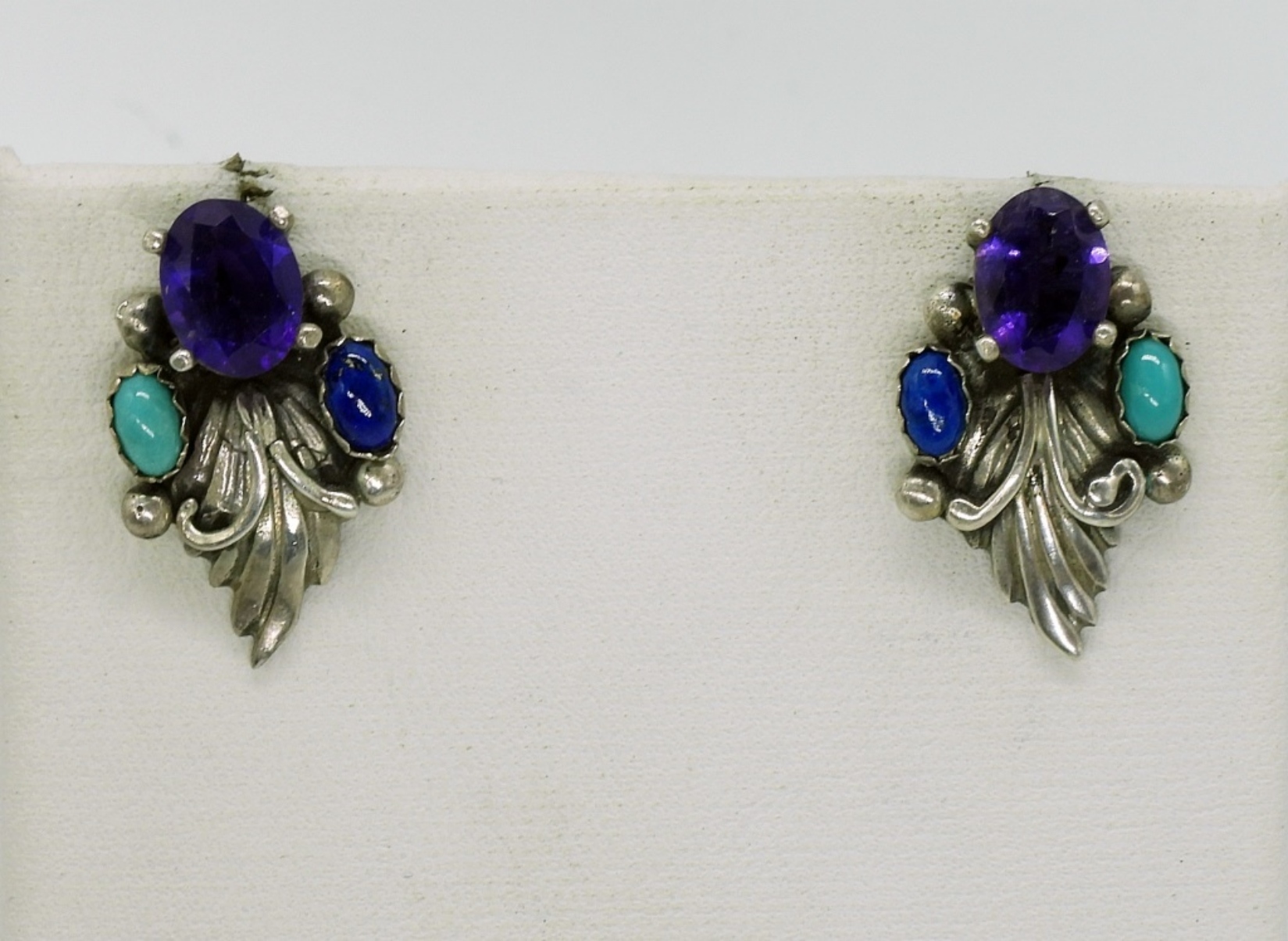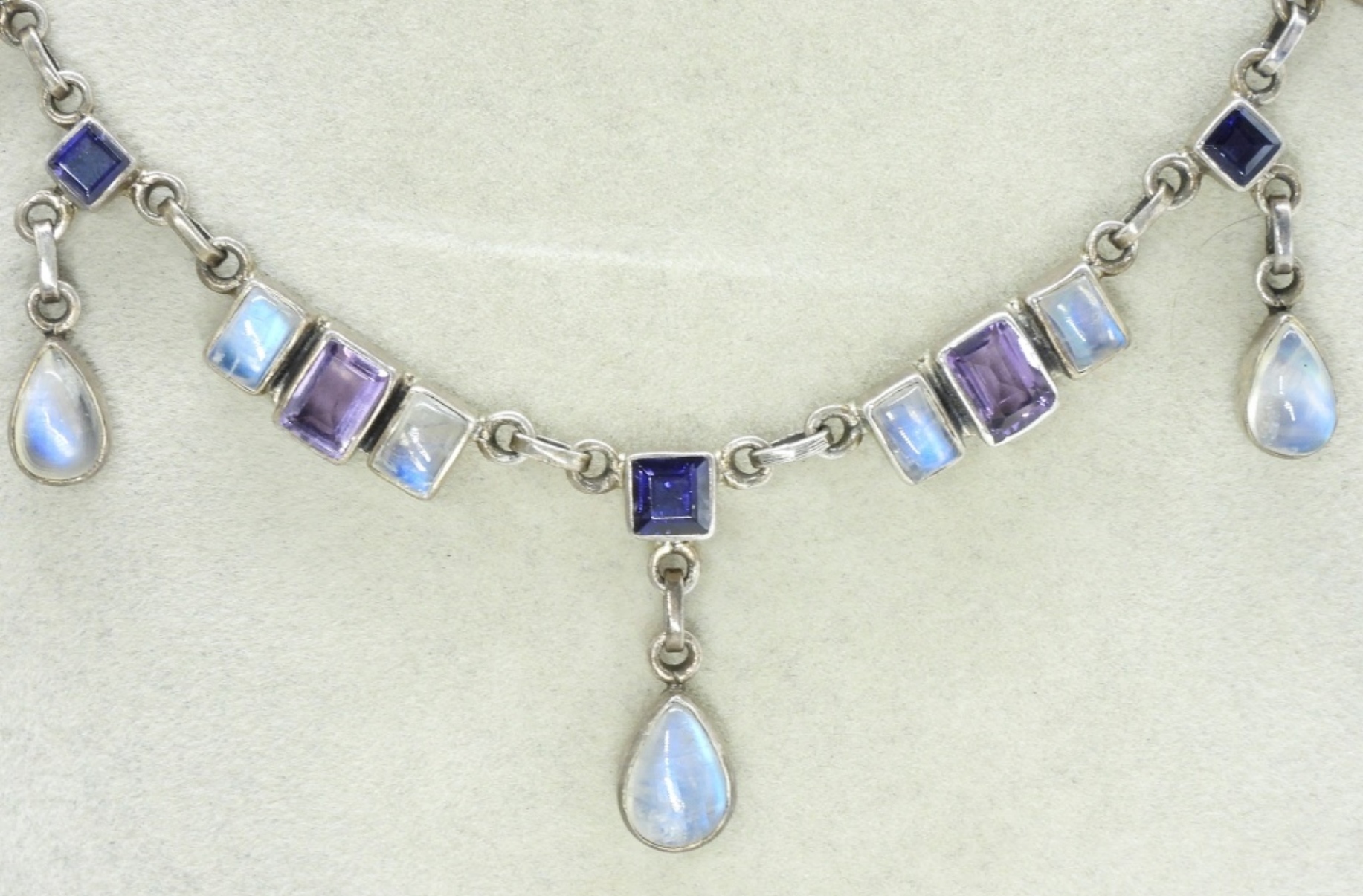 Two sterling necklaces with Amethyst and Moonstone gemstones. 16″ & 19″. One pair of pierced earrings. (26 dwt)