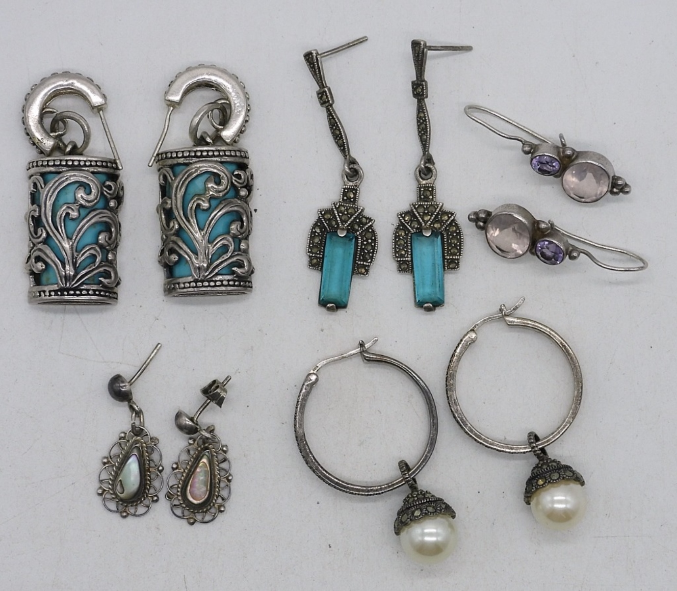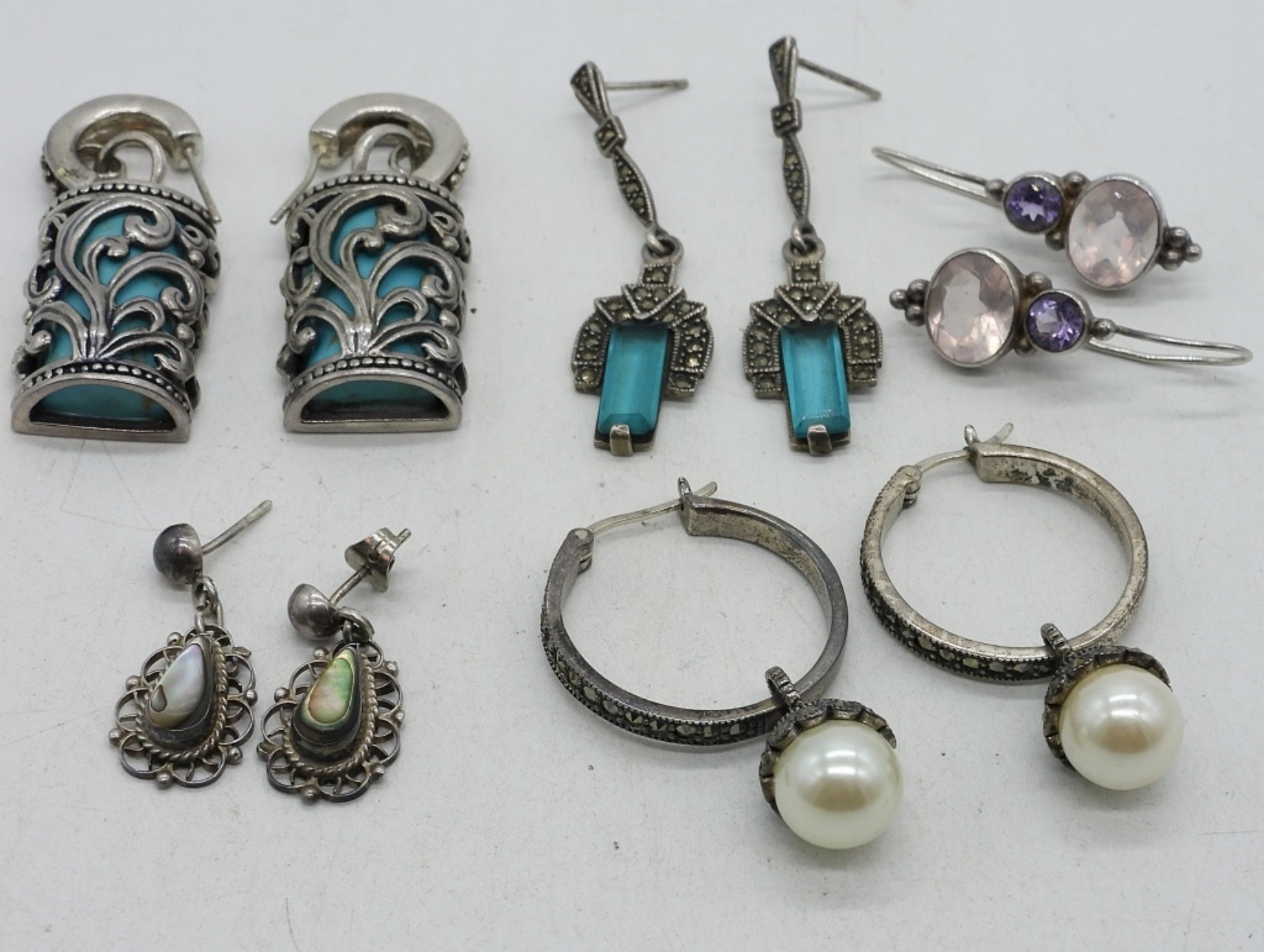 Five pair of sterling pierced earrings. Most have marcasite. Pearl, Amethyst, Rose quartz, abalone & more. (33 dwt)