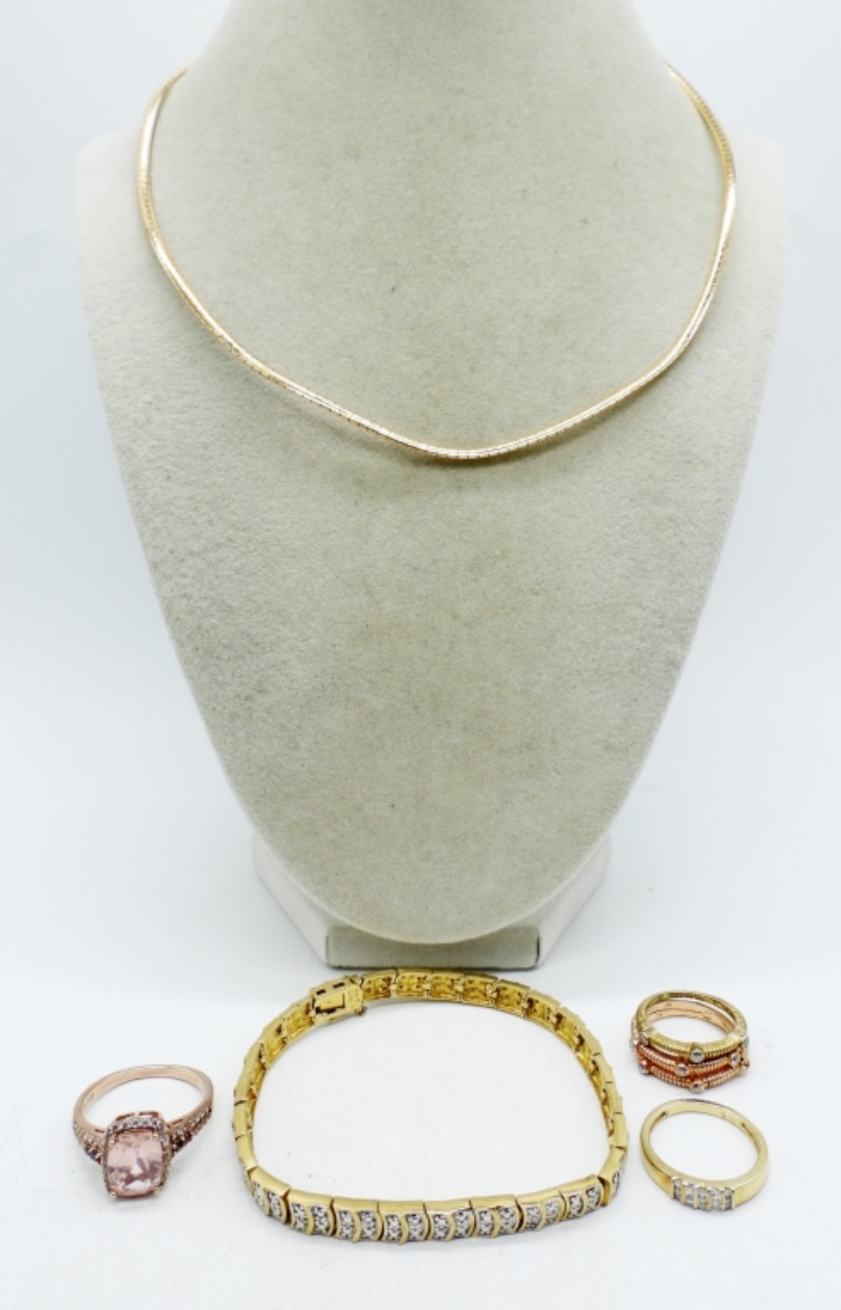 Rose & Yellow gold toned sterling. Necklace is 18″. Bracelet, 7″. Five sterling rings, sizes 6-10. (23.5 dwt)