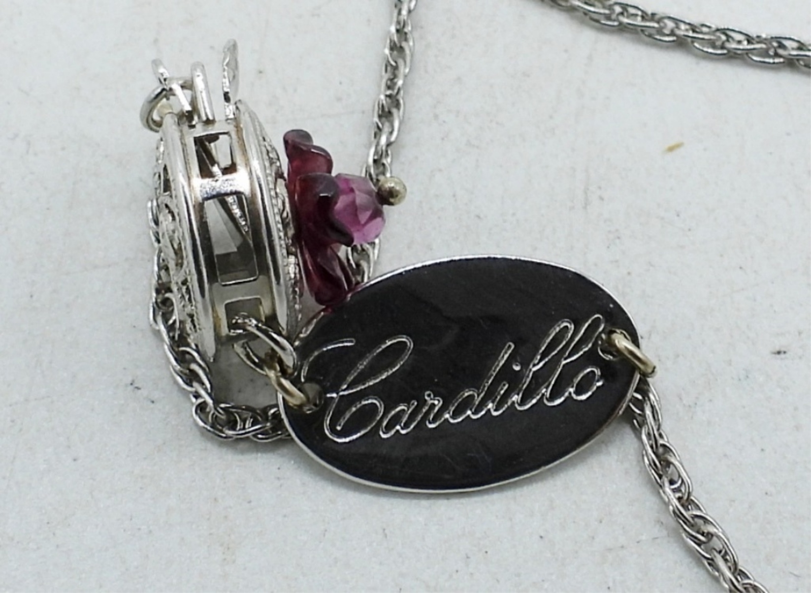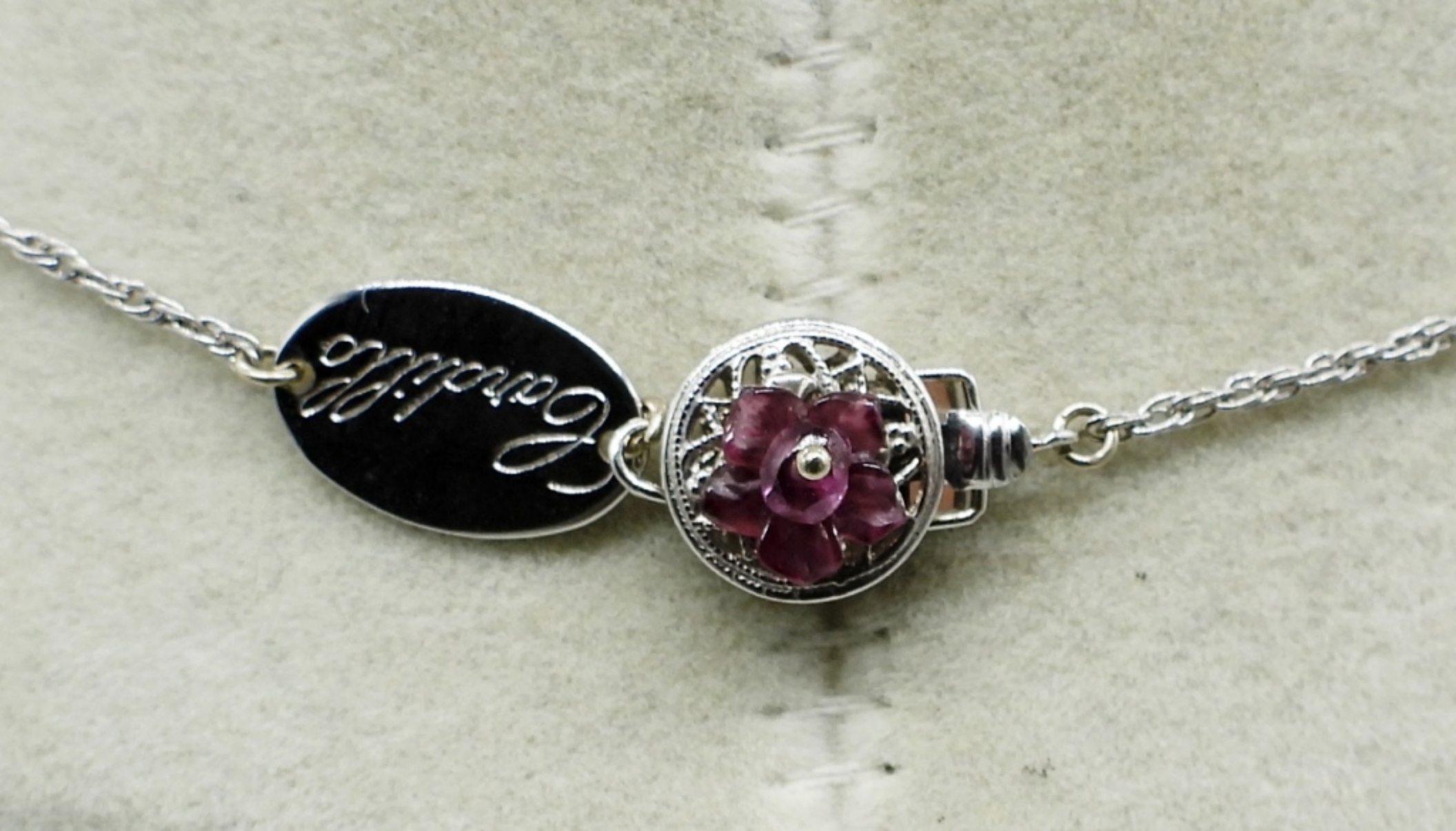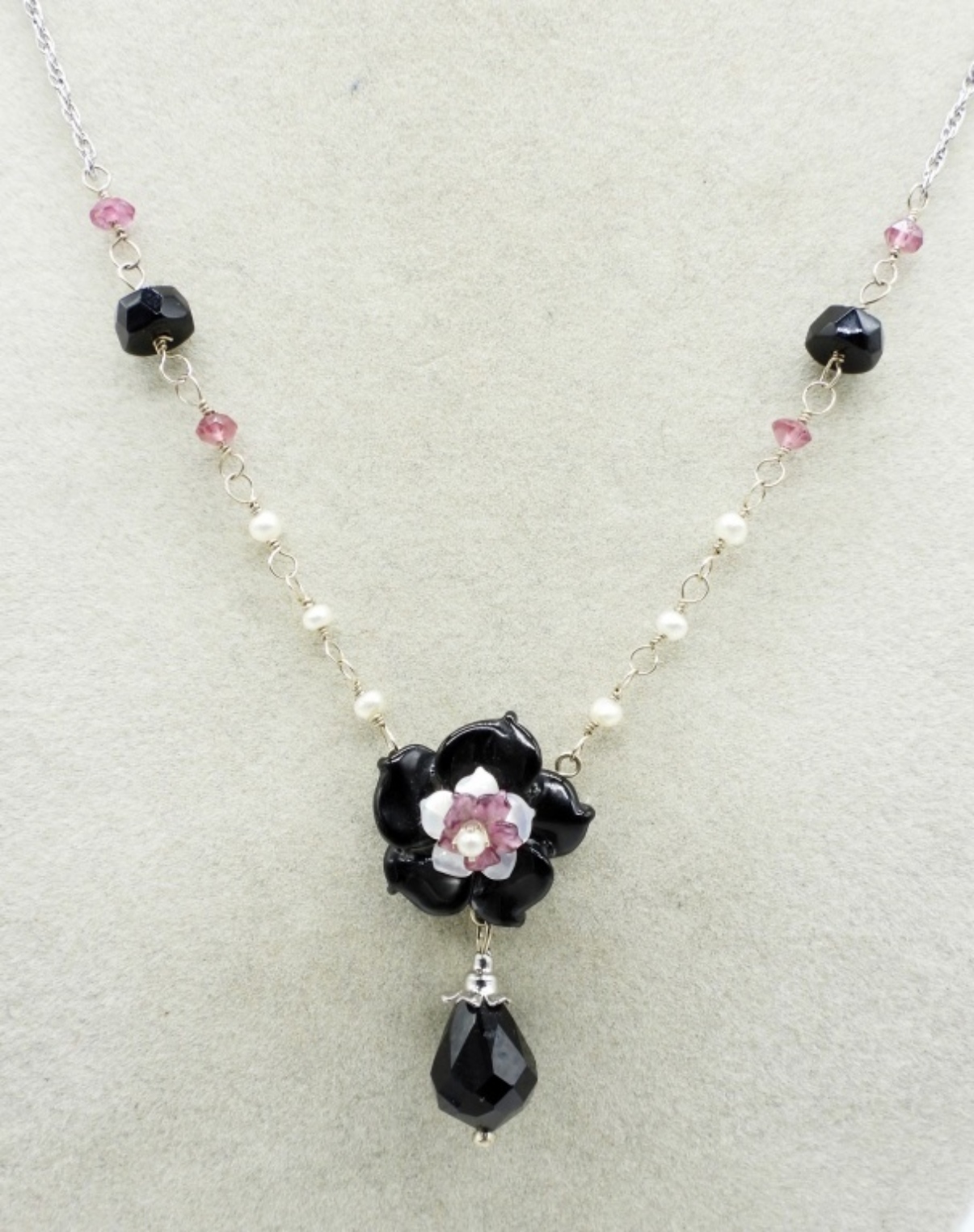 Cardillo name brand 14k white gold necklace with a gemstone flowers, topped with a seed pearl. Faceted accent beads. Chain and clasp have tested as 14k, clasp marked 14k. 17″ long. (2.2 dwt)