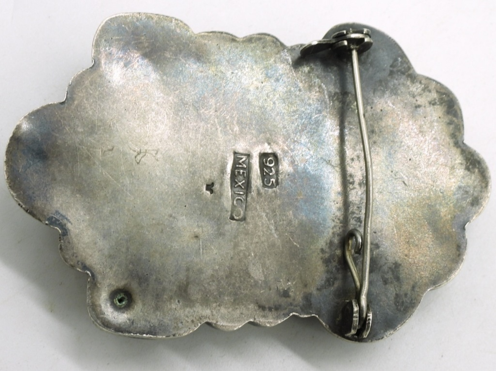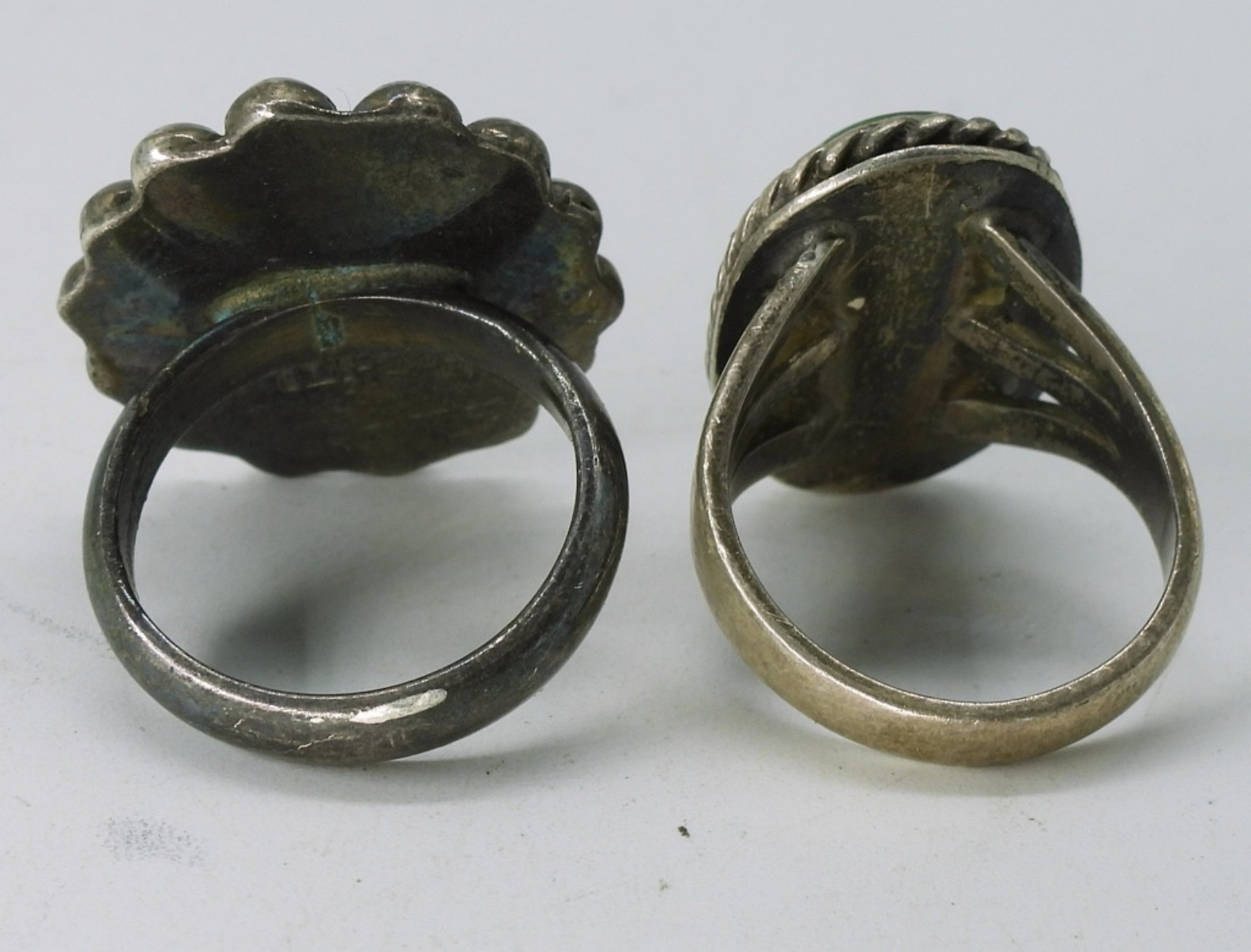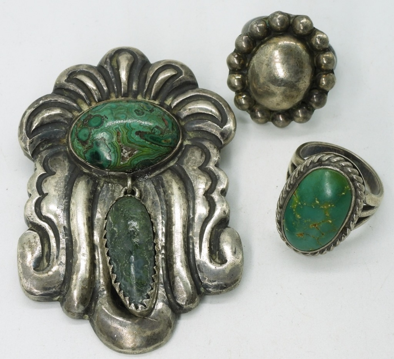 Vintage sterling brooch with two large turquoise gems, 2.5″ x 1 3/4″. Taxco sterling ring, size 6. Turquoise sterling ring, size 5. (27.1 dwt)