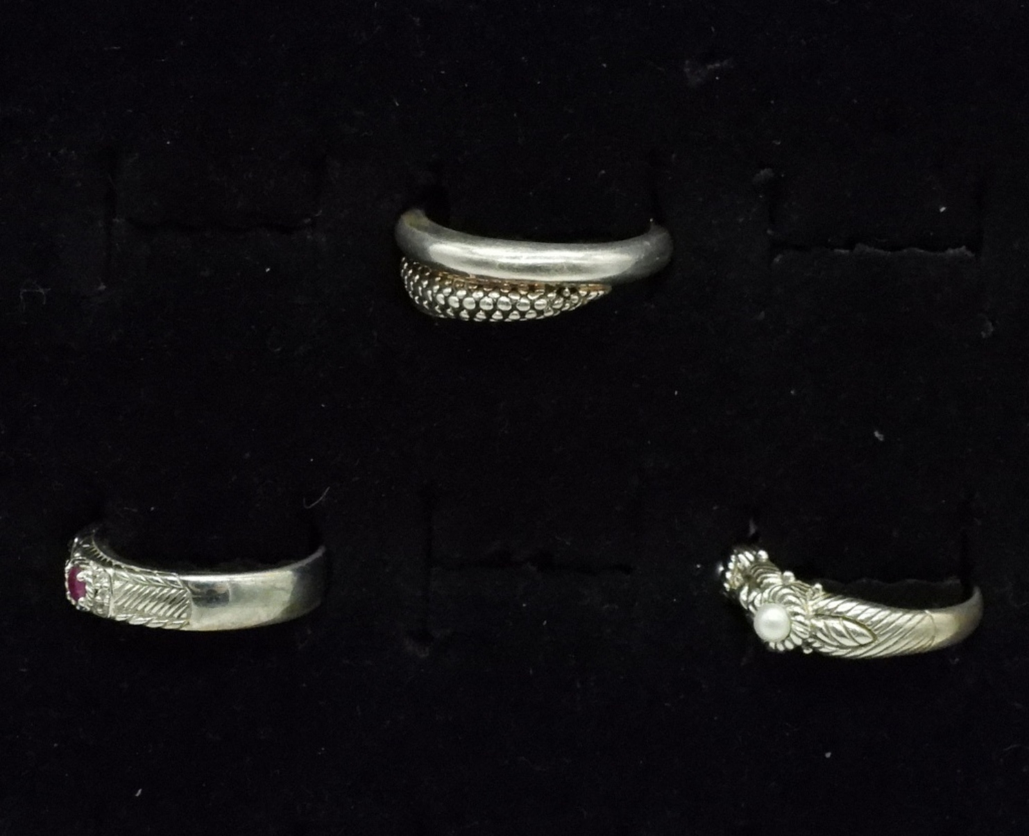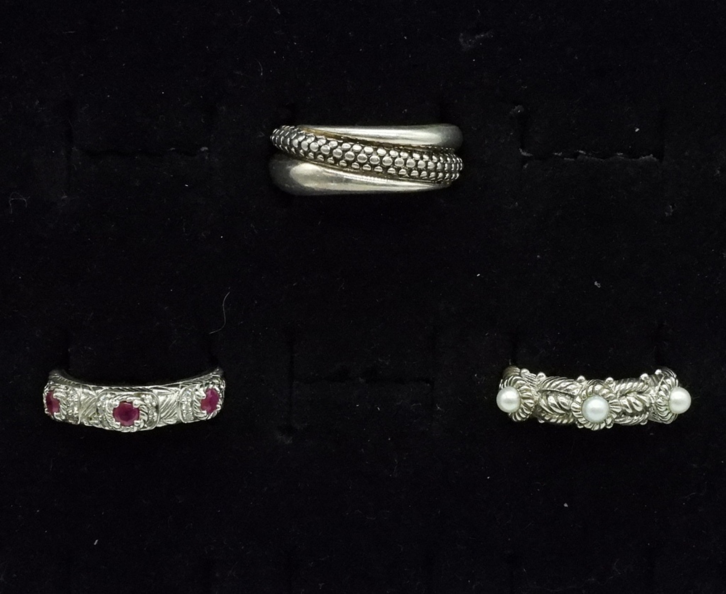 One sterling Michael Dawkins ring, size 9. Two sterling Judith Ripka rings, size 8. (14 dwt)