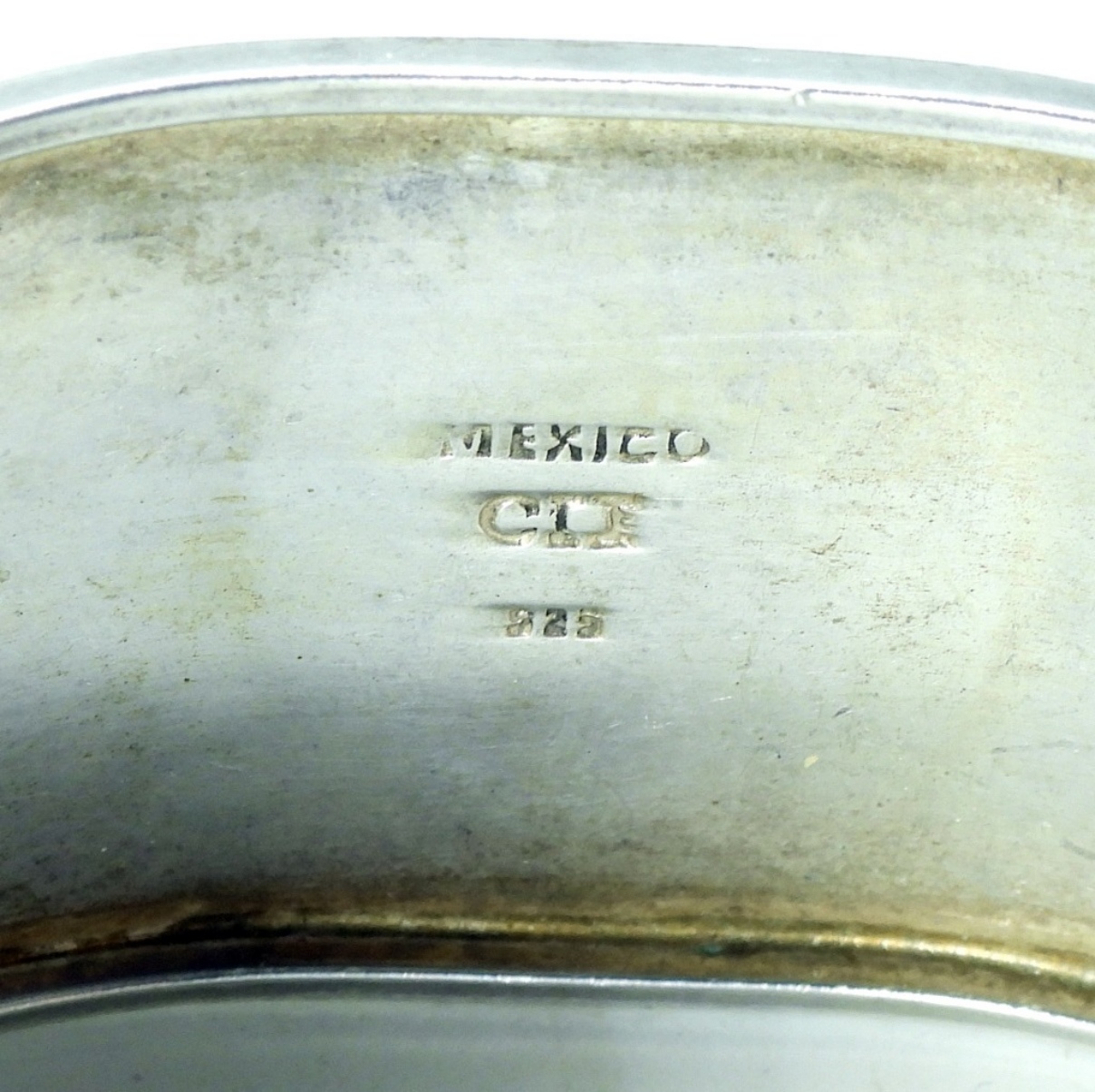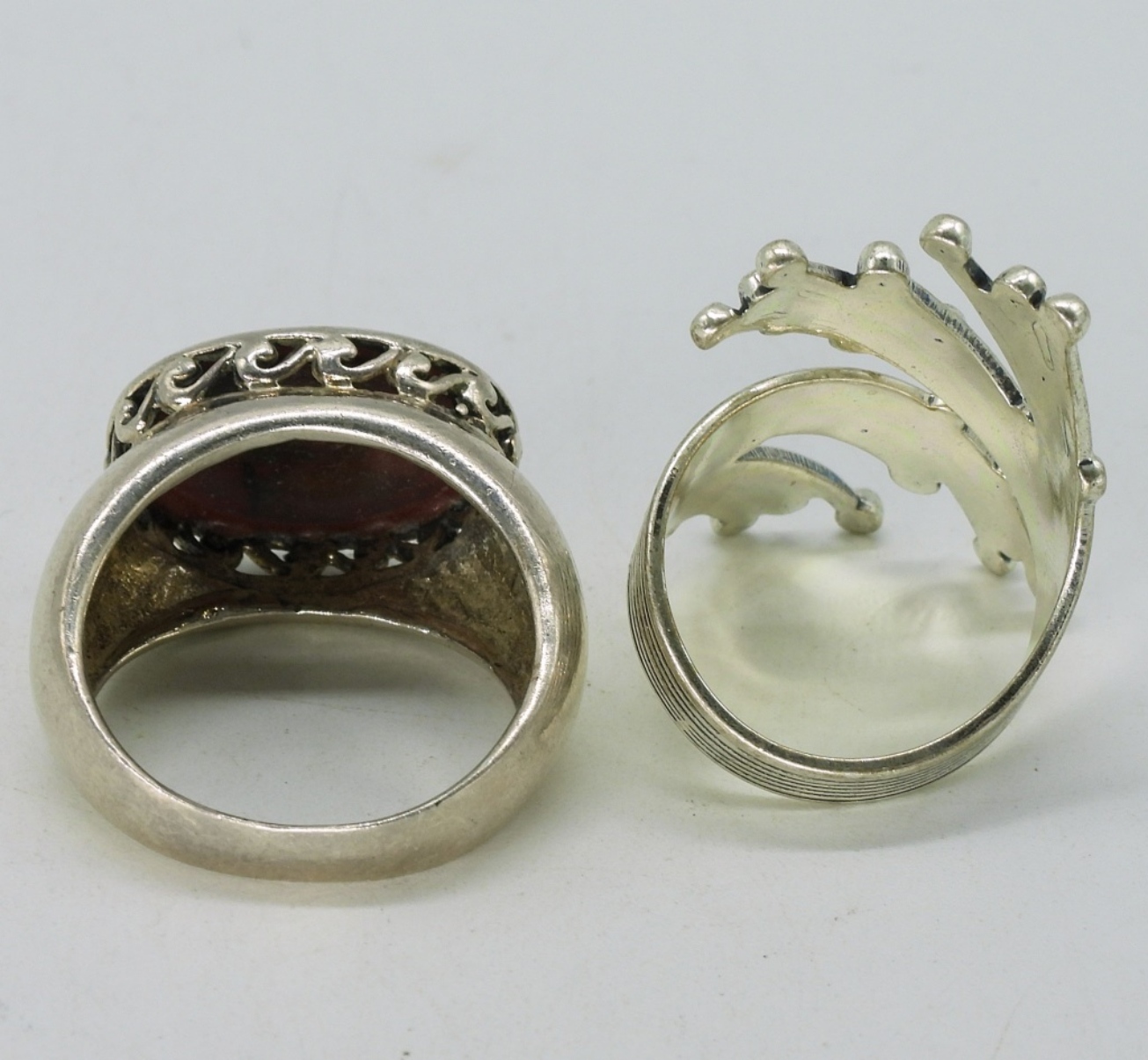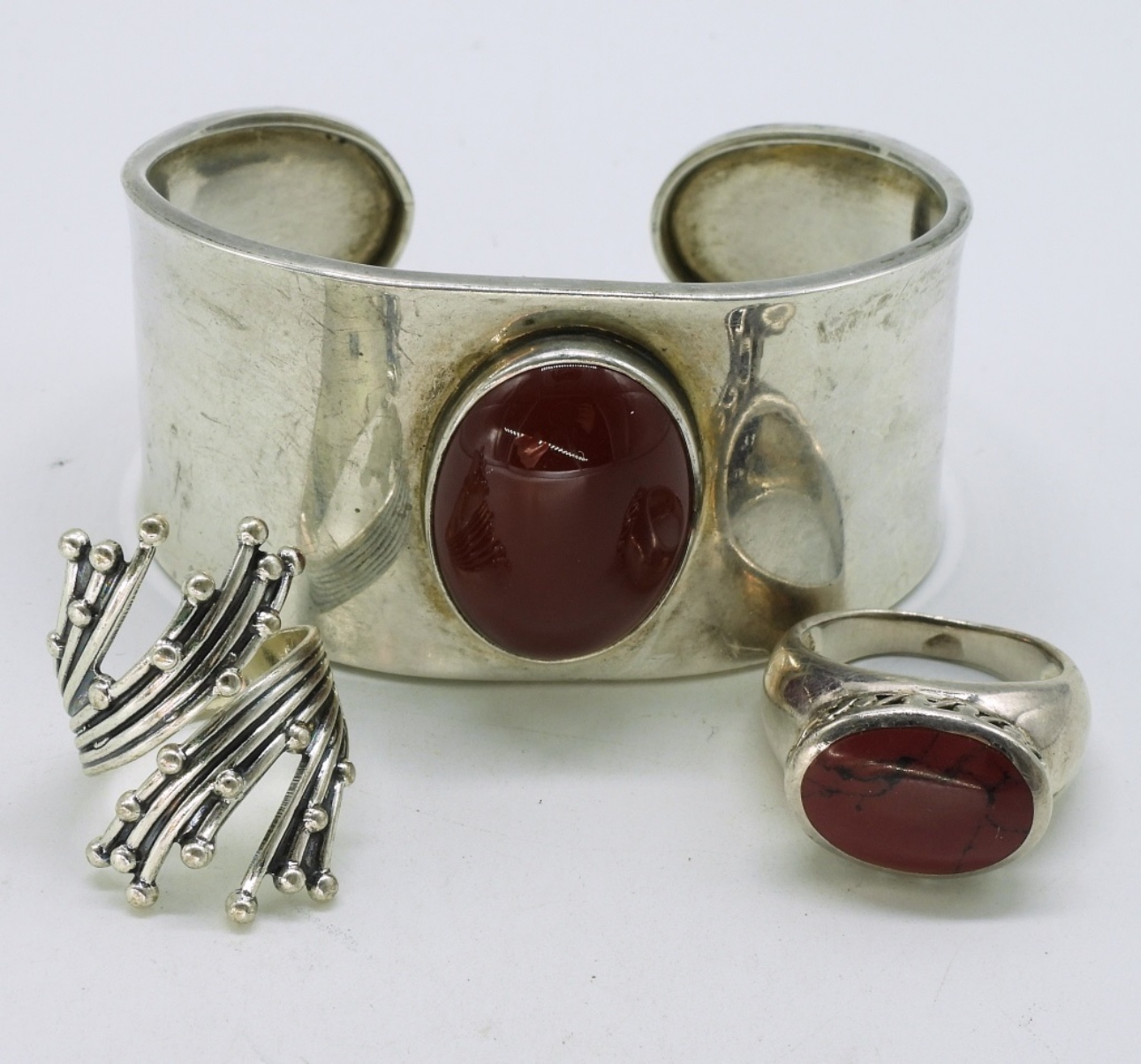 Wide sterling cuff bracelet with large red stone, marked “Mexico CII 925”. Two sterling rings, size 6 & 7.5 (25.8 dwt)