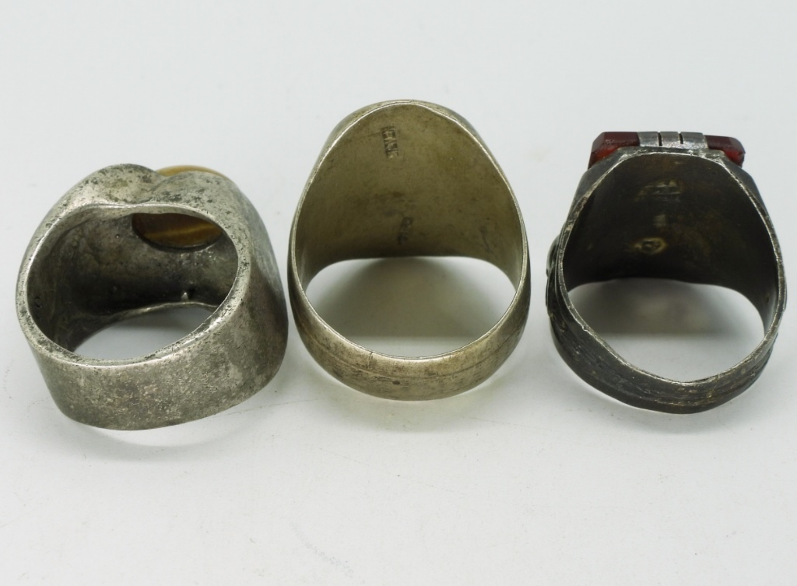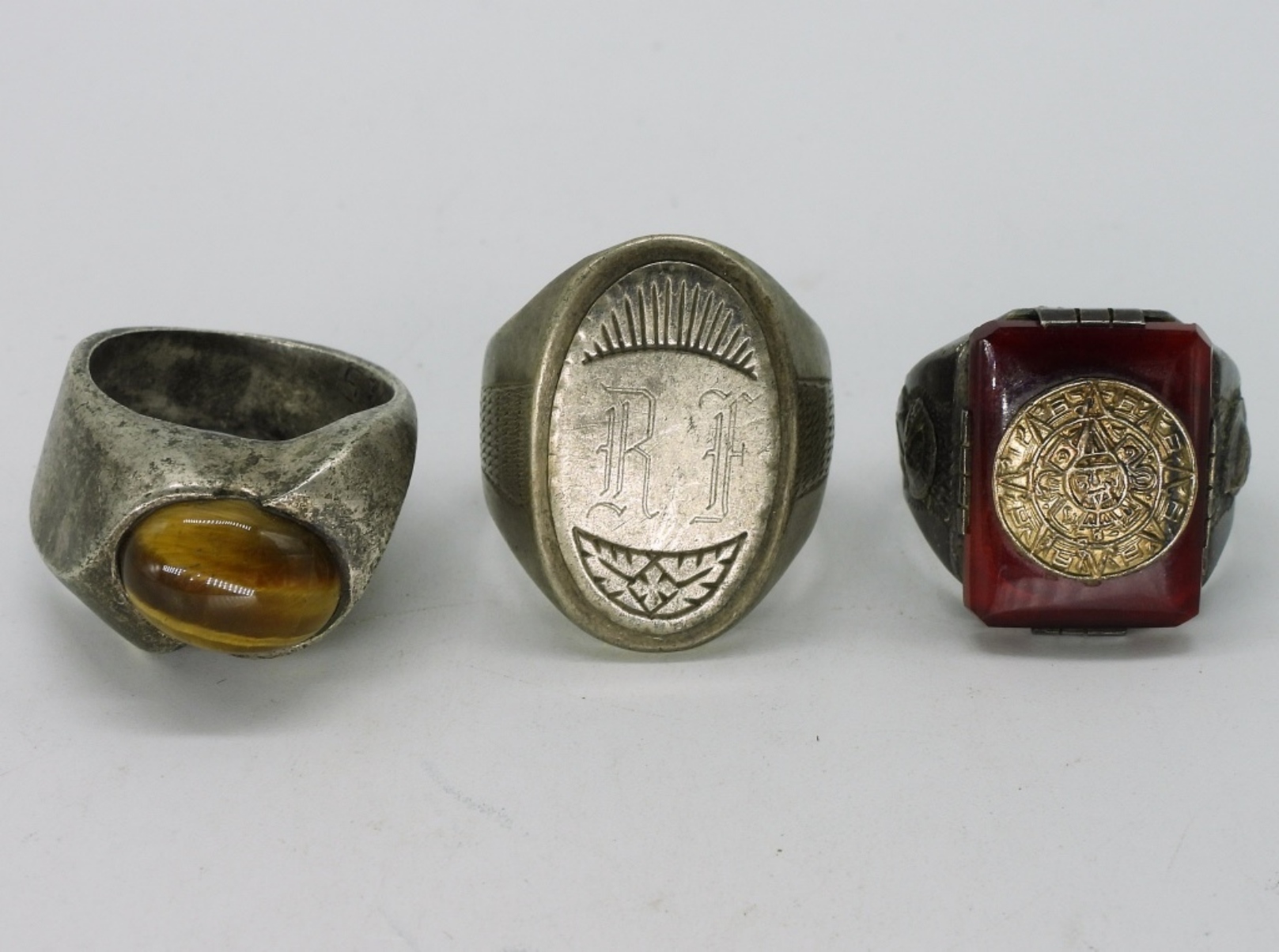 Three rings, Mexico Silver. Tigers eye, Mayan & one engraved with “RF” & a design. Sizes 9.5, 11, 12 (28 dwt)