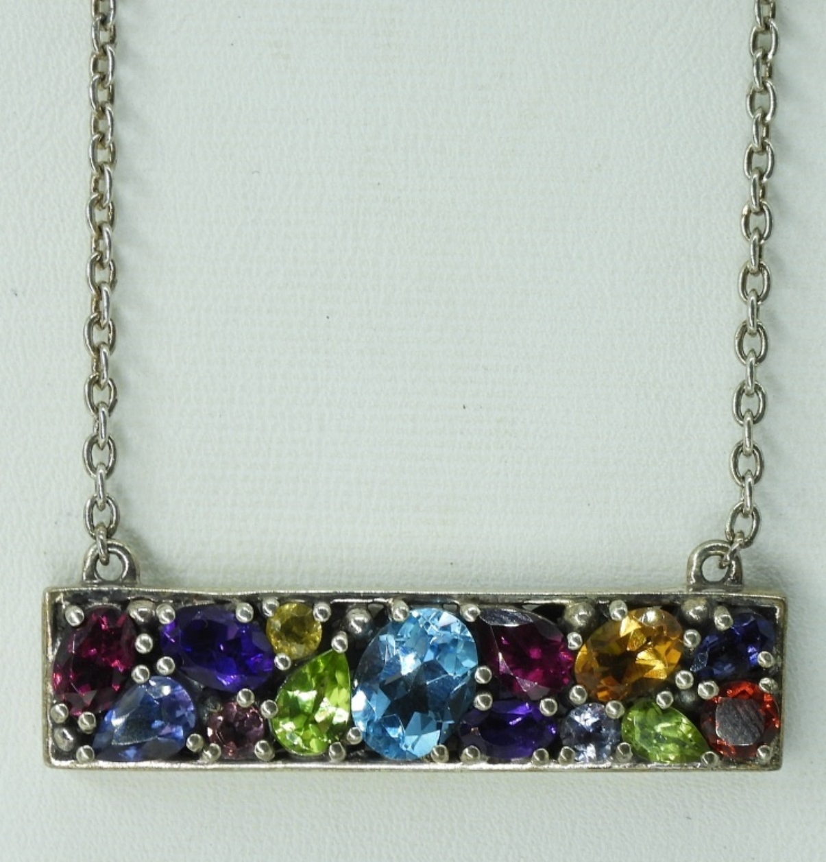 Seven sterling rings with multi colored gemstones, simulated and genuine. Sizes 5-8. Multi colored gemstone necklace, 20″ long. (22 dwt)