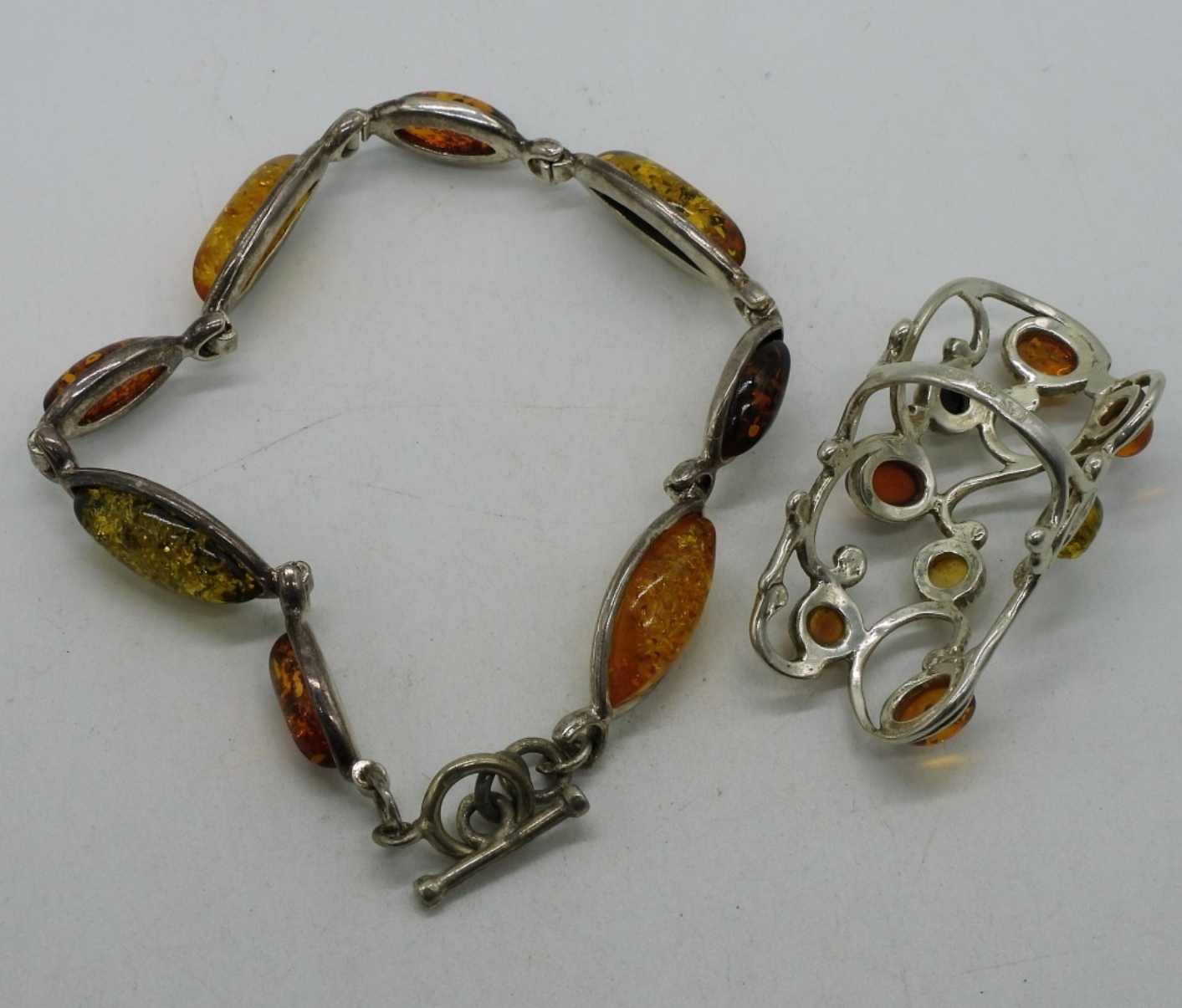 Yellow, Green & Orange Amber gemstones bracelet, 7″. Matching sterling ring, size 7. (12 dwt)