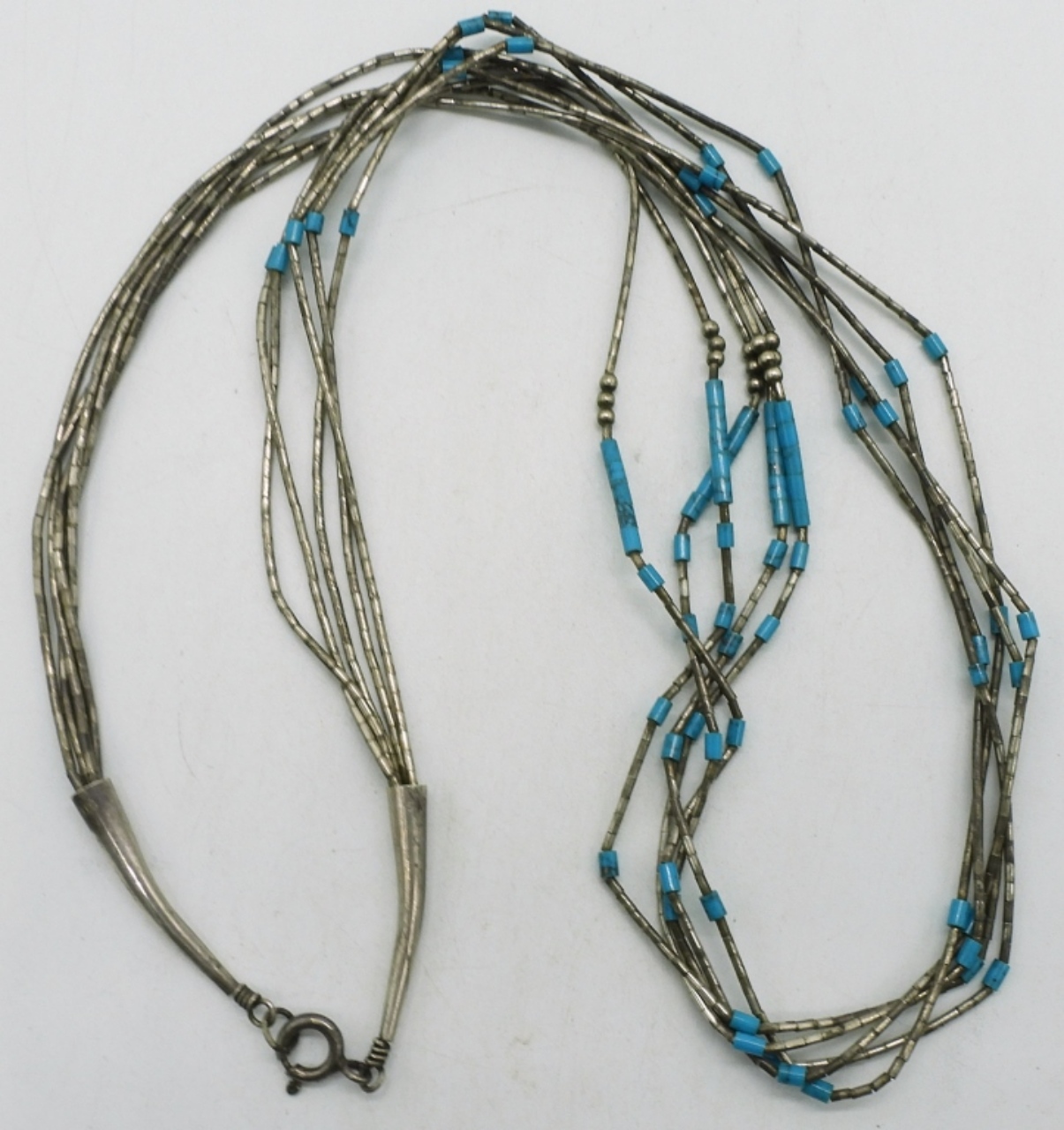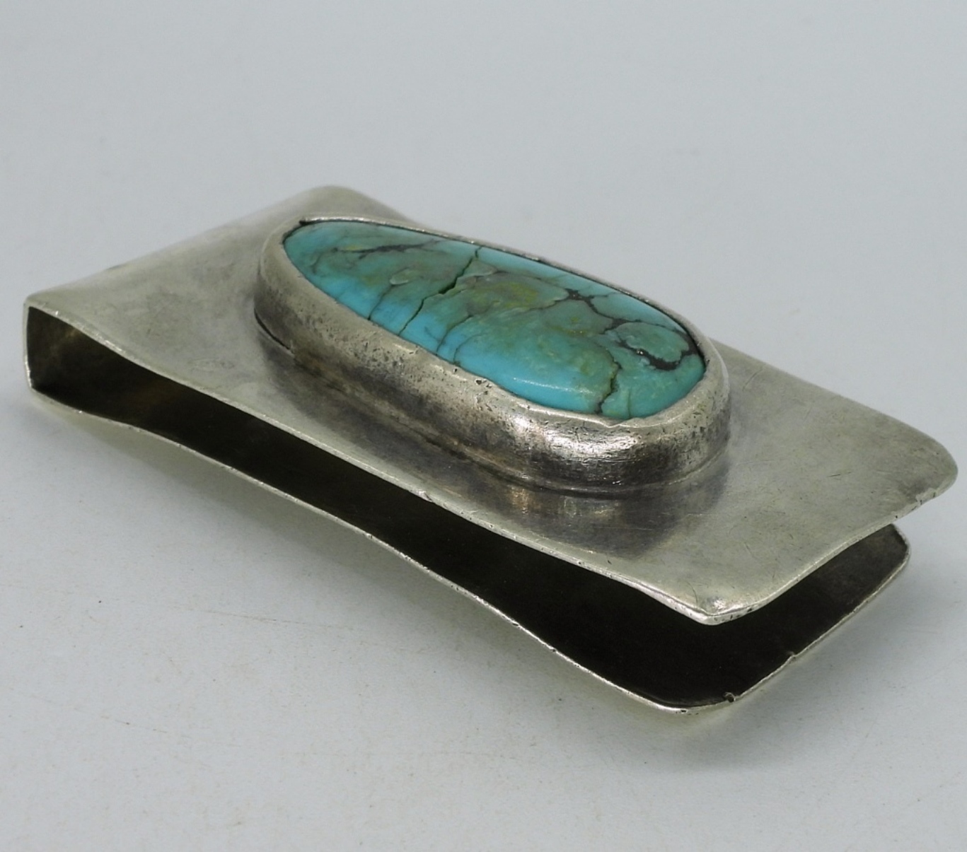 Liquid sterling necklace with turquoise beads, 22″ long. Vintage sterling money clip with large turquoise gemstone. (20 dwt)