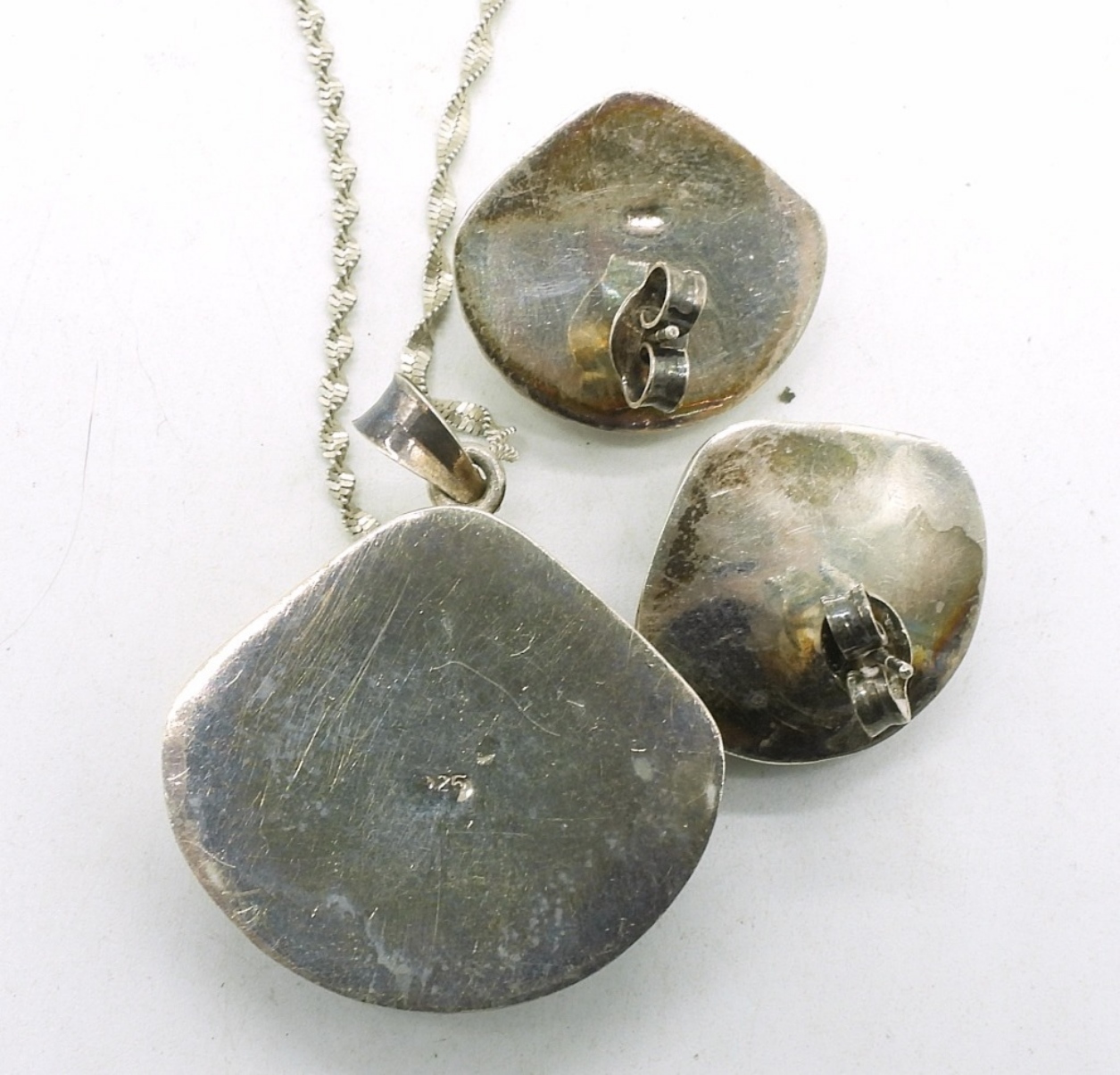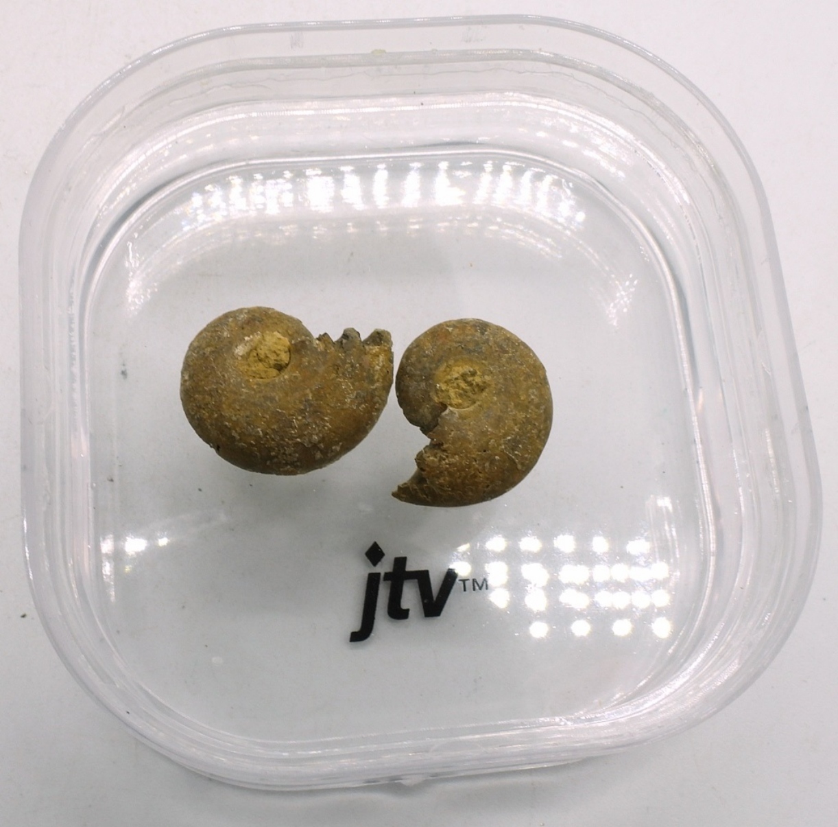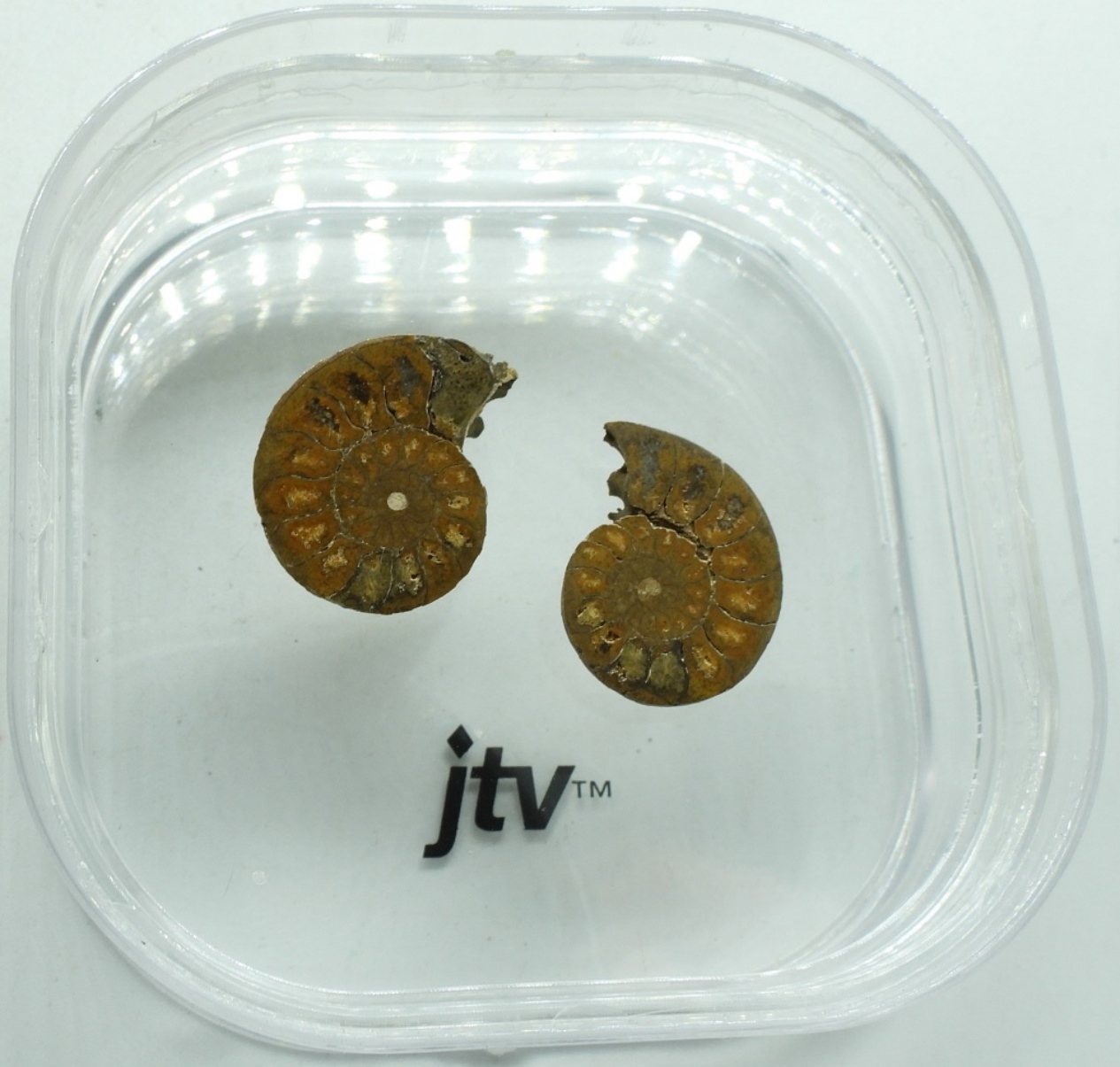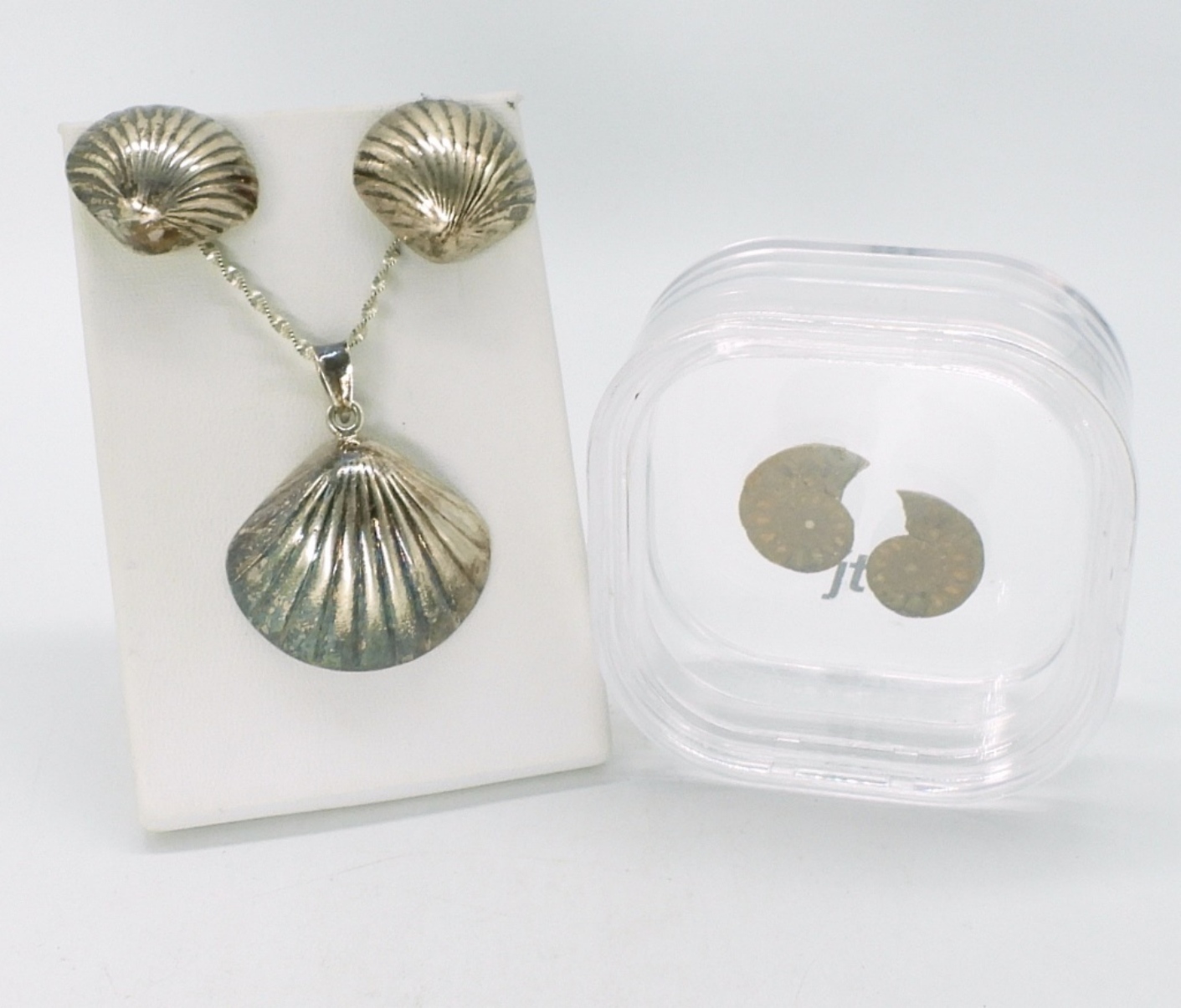 Sterling seashell pendant on a 20″ sterling chain. Matching pierced seashell earrings. Two loose Ammonite fossils in a JTV container. (11.5 dwt)