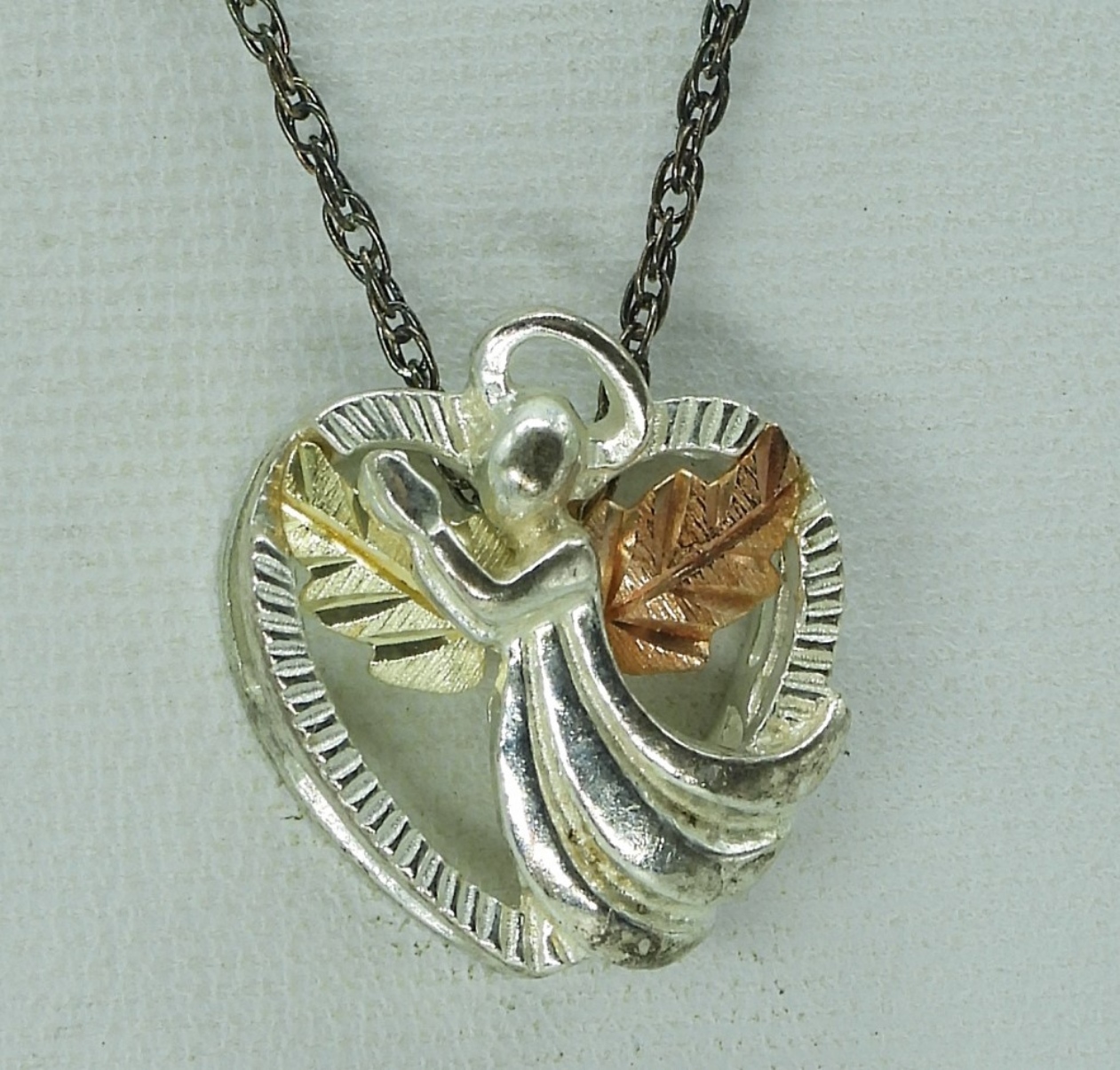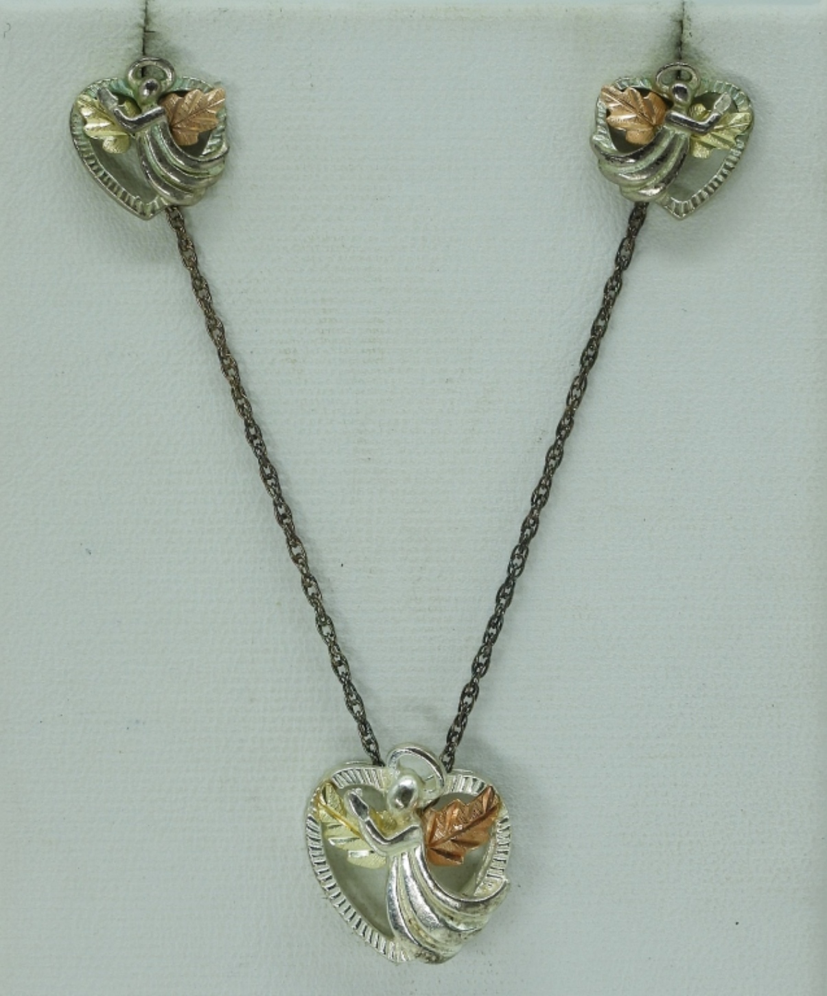 Small angel in sterling with 12k gold accents, necklace is 18″ long. Matching pierced earrings. (3.6 dwt)