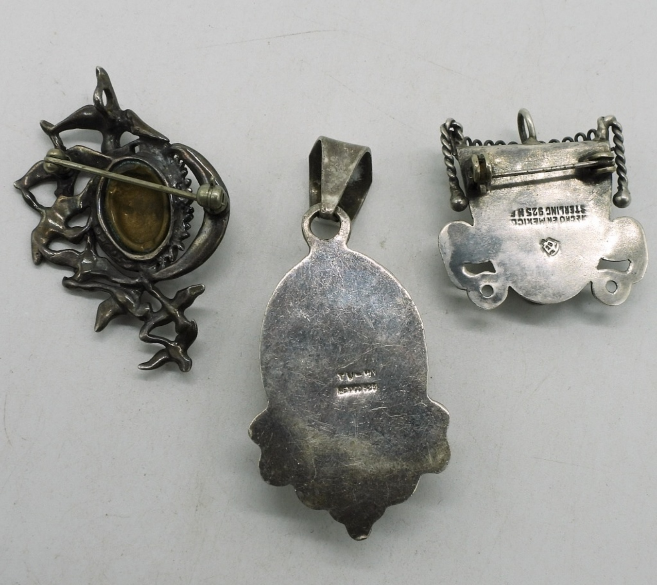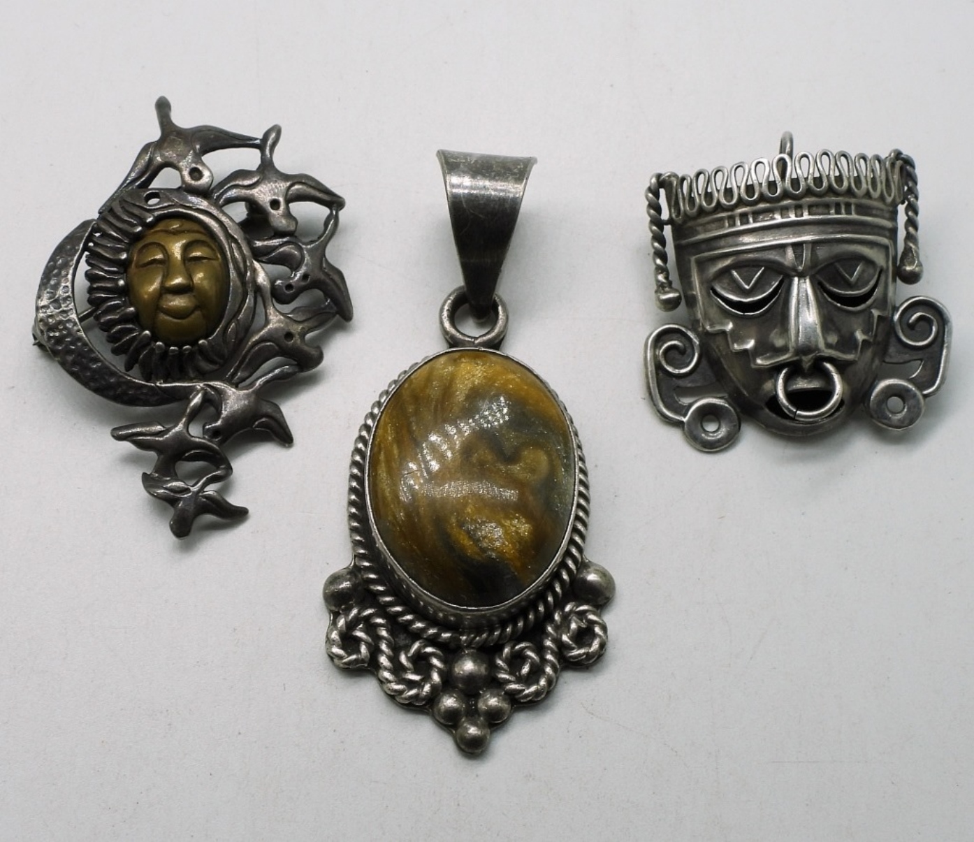 Taxco sterling pendant with a sparkly tigers eye gemstone, 2 1/4″ long. (TV-41). Two sterling pins, 1.5″ long. (20.6 dwt)