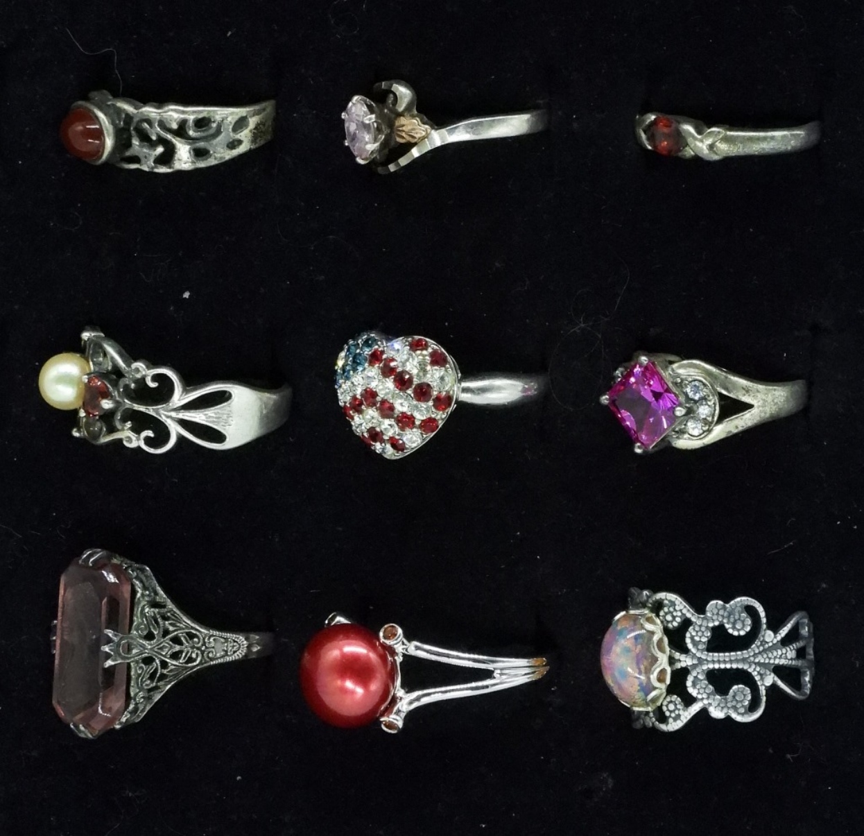 Nine sterling fashion rings. Mostly red and pink simulated gemstones. Sizes 6 – 10 (23 dwt)