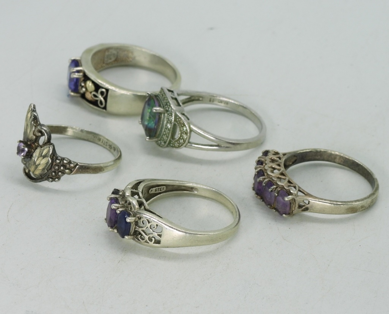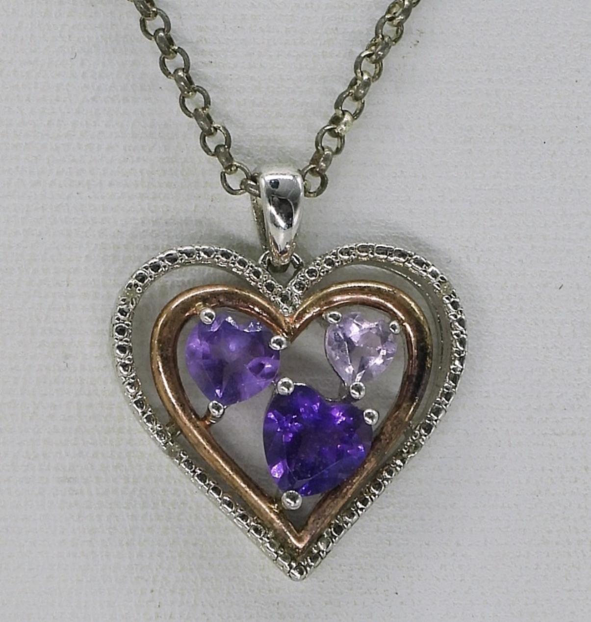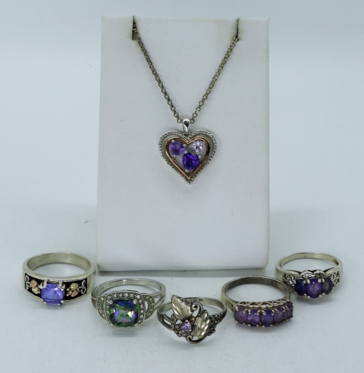 Heart shaped sterling amethyst pendant on a 24″ sterling chain. Five sterling rings with amethyst and mystic topaz gemstones. Sizes 10 & 11. (18 dwt)