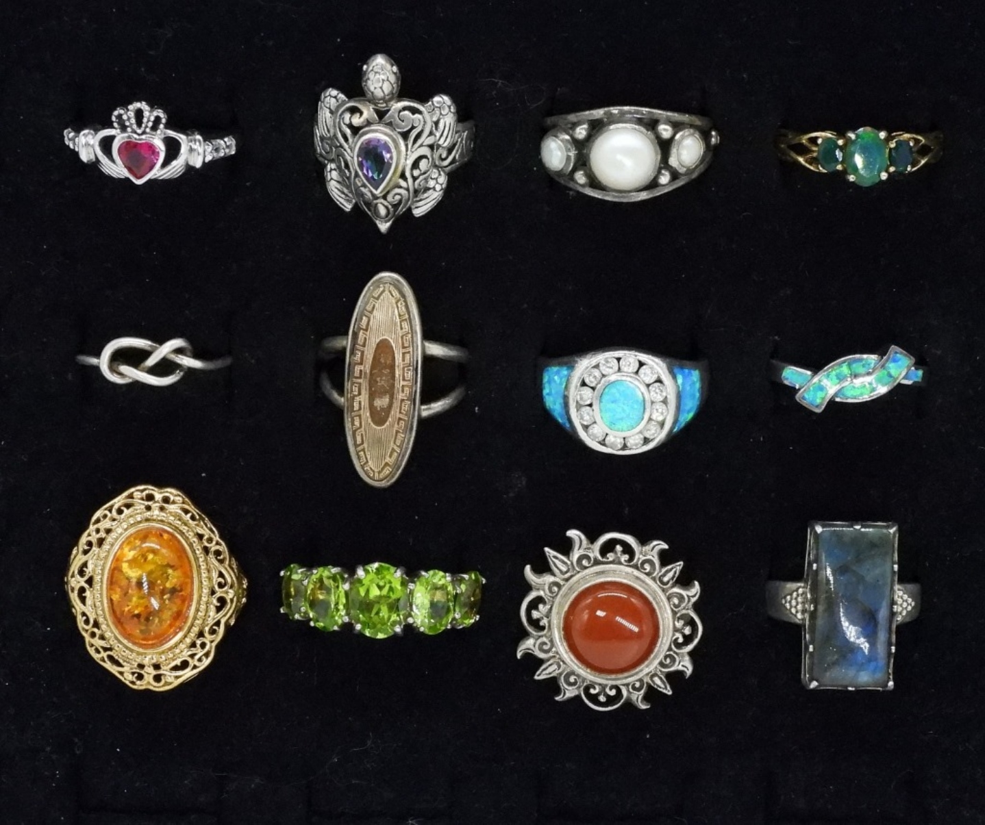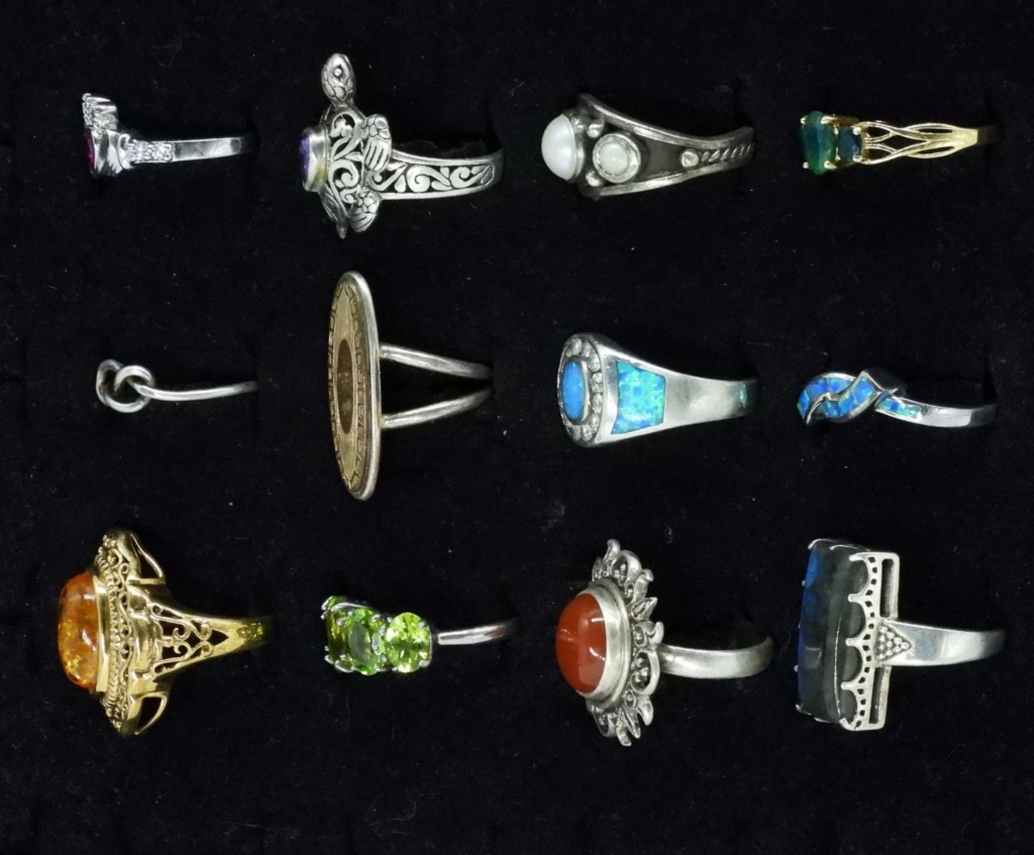 Twelve sterling fashion rings, various styles and gemstones. Sizes 6-8. (34 dwt)