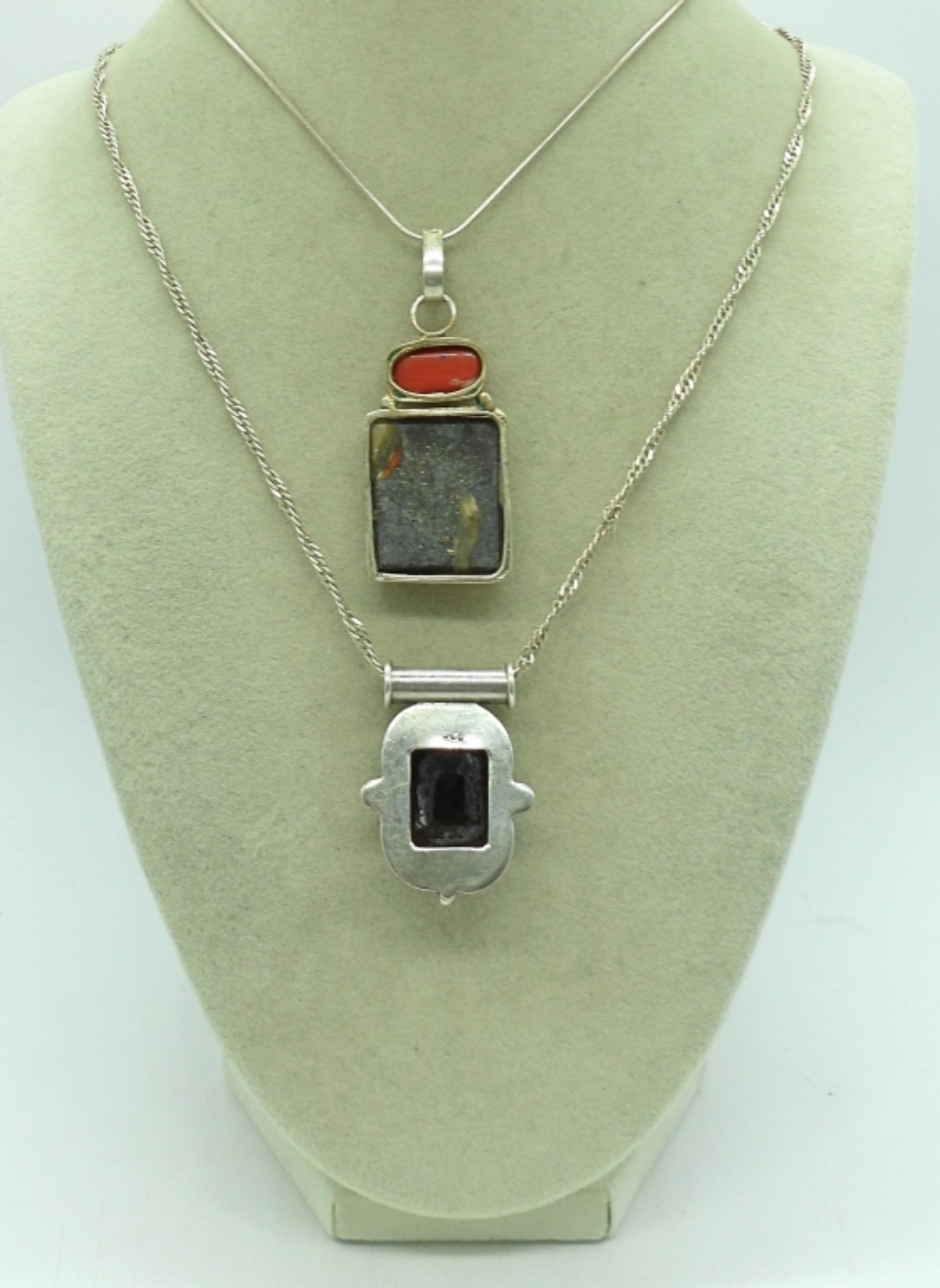 Two sterling pendants on 20″ & 23″ sterling chains. One pair of sterling pierced earrings with garnet colored earrings. 2.5″ long. (26.3 dwt)