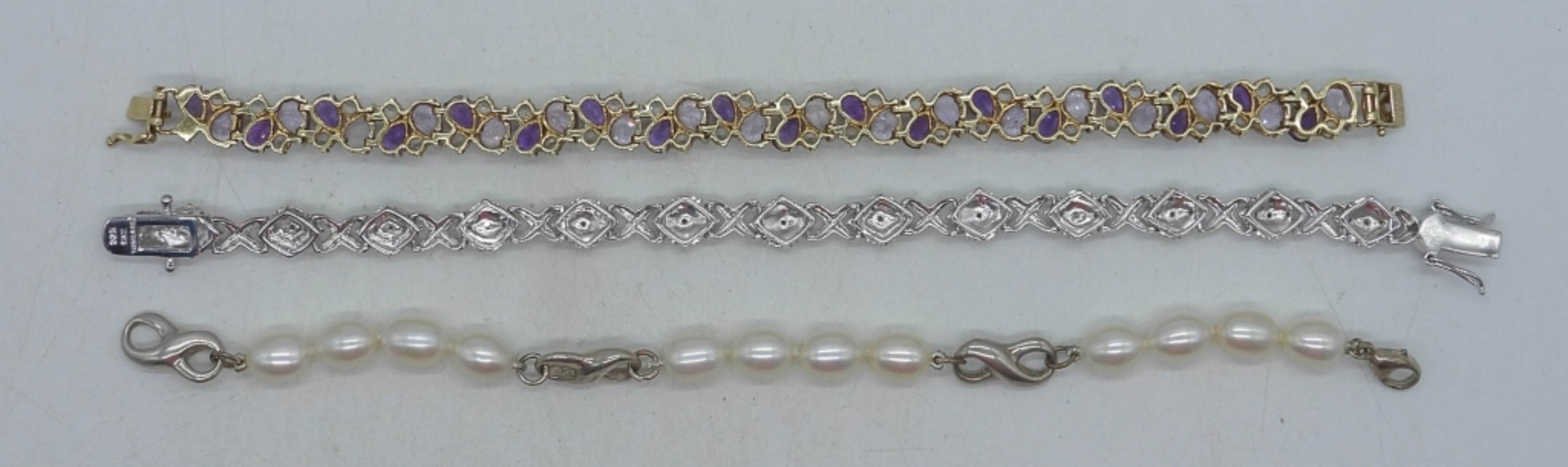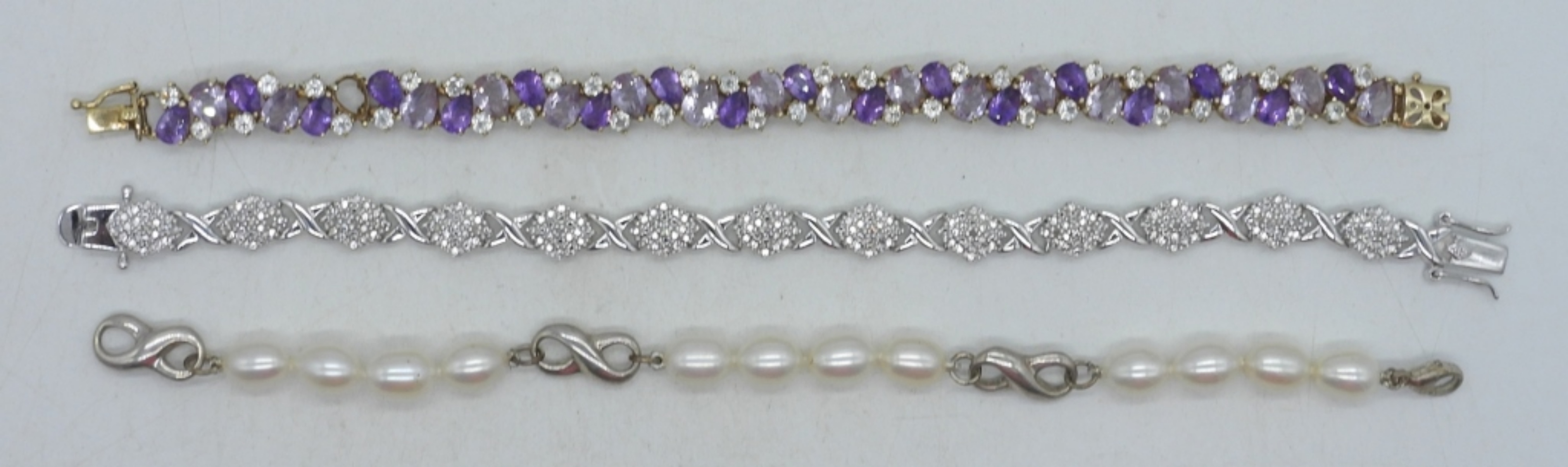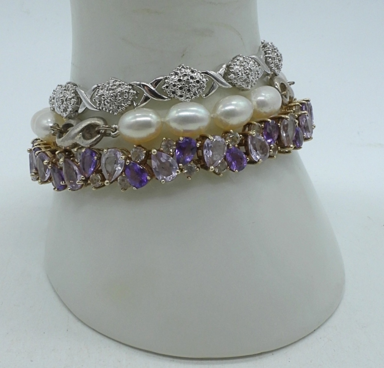 Three sterling fashion gemstone bracelets. Pearl, Amethyst & Diamond. 7-7.5″ long. (23 dwt)