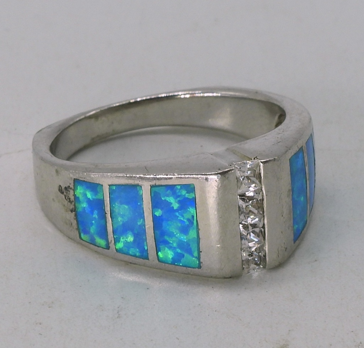 Blue opal sterling necklace, ring and pierced earrings. Ring is size 8. Earrings hang 1.5″ long. Necklace is 18″. (12.7 dwt)