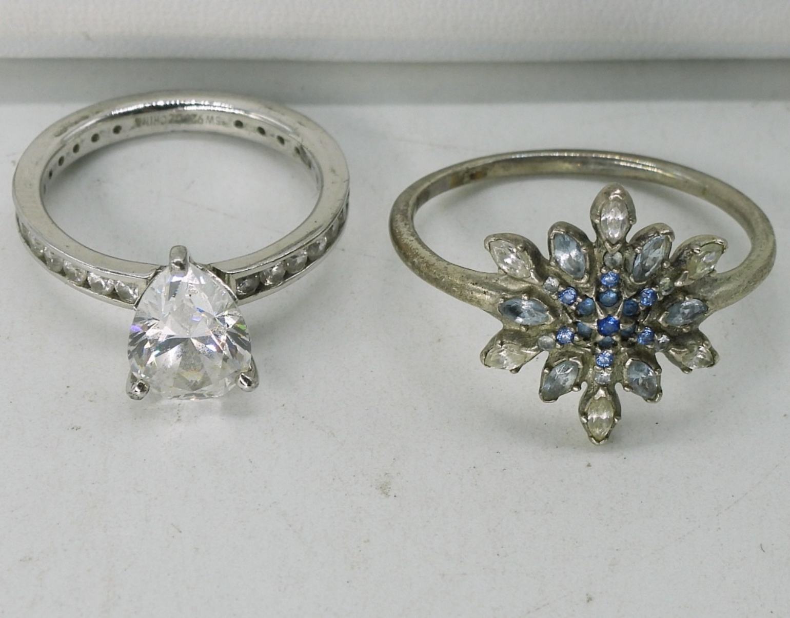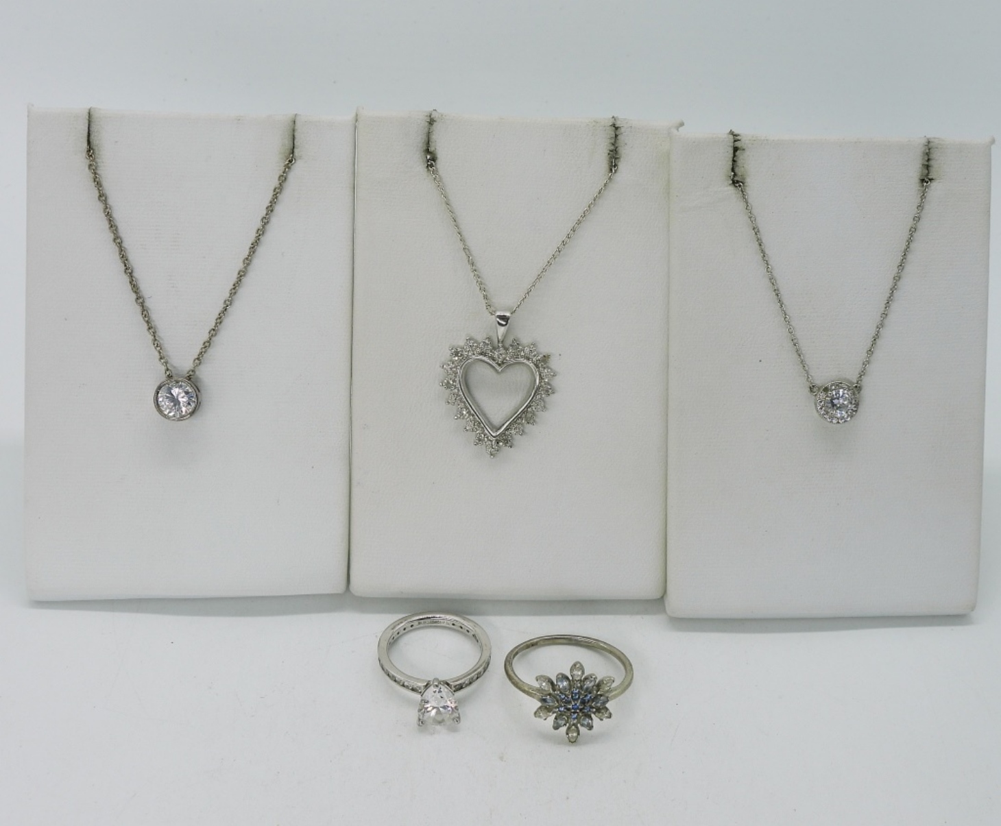 Simulated diamond necklaces and rings. Necklaces are 16″ & 18″. Two sterling rings, sizes 6 & 10. (9.3 dwt)