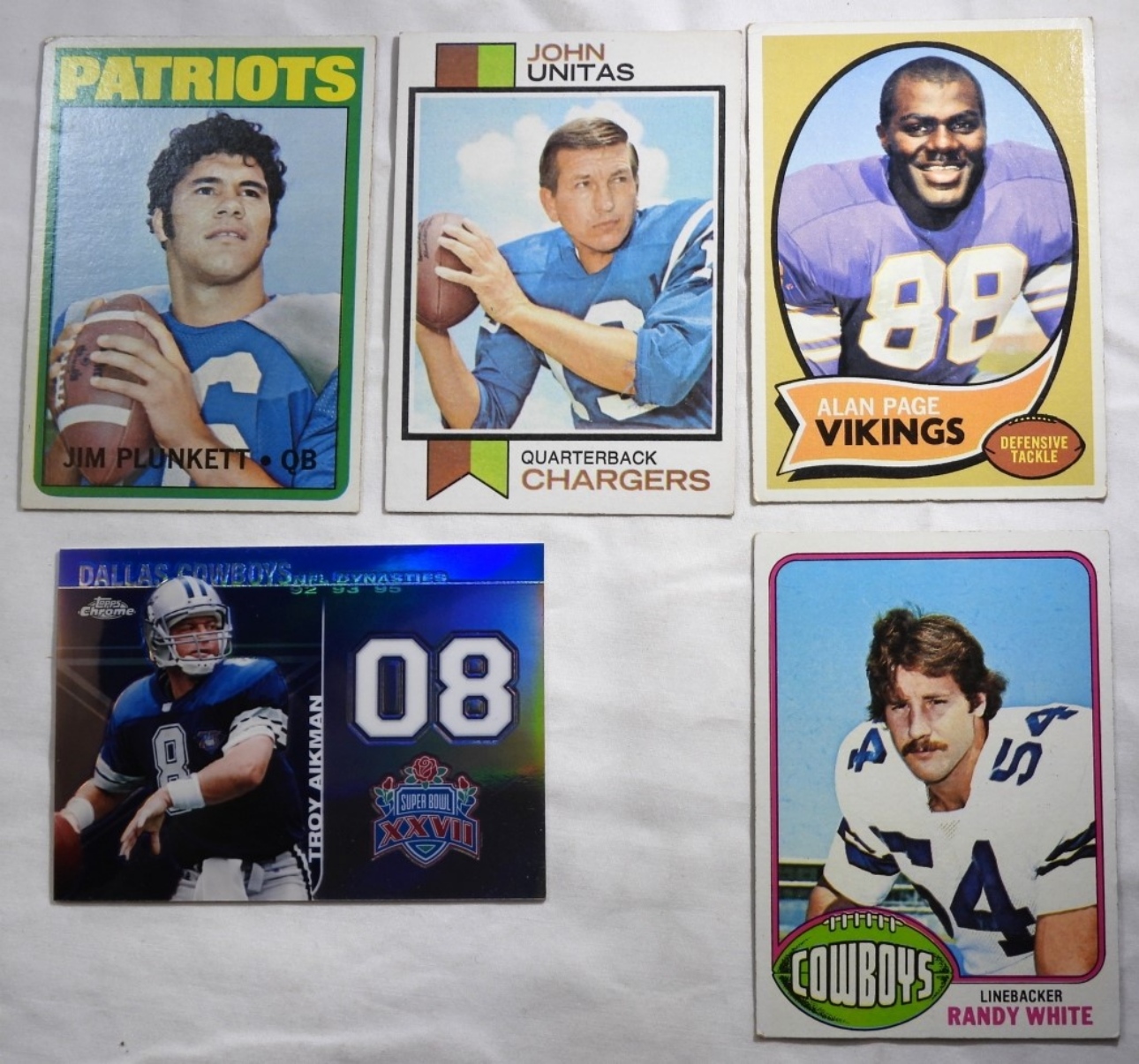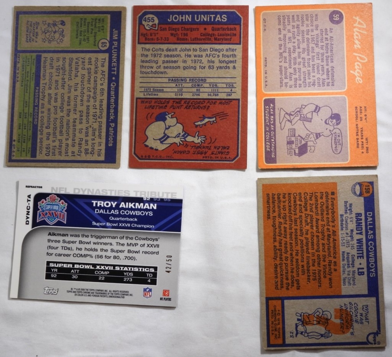 1) Randy White # 158. 2) Troy Aikman. 3) Jim Plunkett #65. 4) Alan Page #59. 5 John Unitas #455.