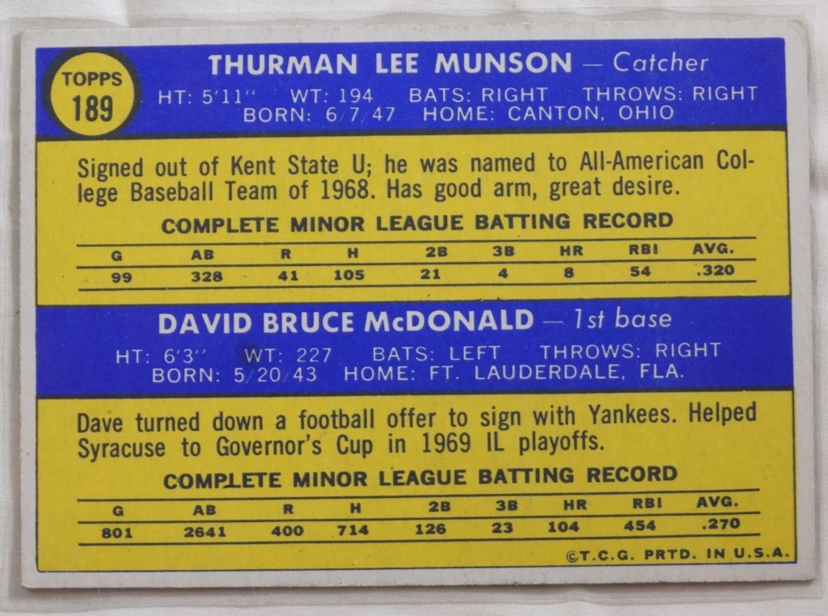 Thurman Munson and Dave McDonald. In VG condition