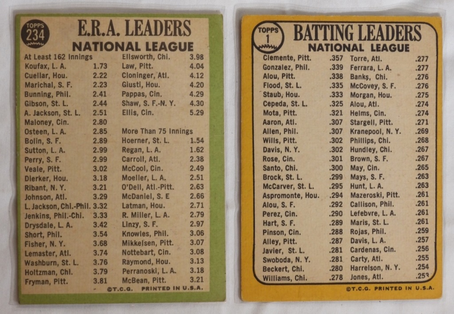 1966 #234 Era Leaders: Sandy Koufax, Mike Cuellar, Juan Marichal. 1967 #1 Batting Leaders: Bob Clemente, Tony Gonzalez, Maty Alou. Both are in good condition, both seem to be off-center