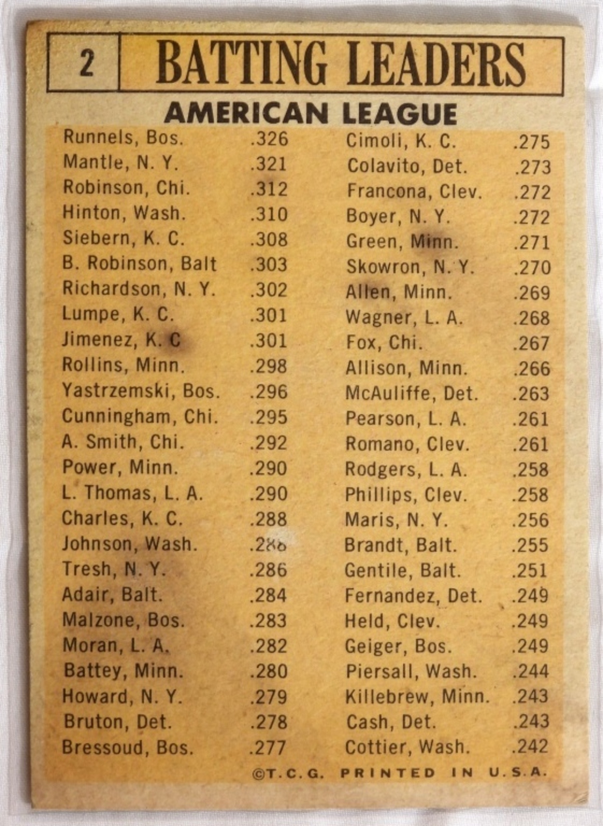 #2 in G condition ( does have black smugs on the back of the card). Mickey Mantle, Floyd Robinson, Chuck Hinton, Norm Siebern, and Pete Runnels