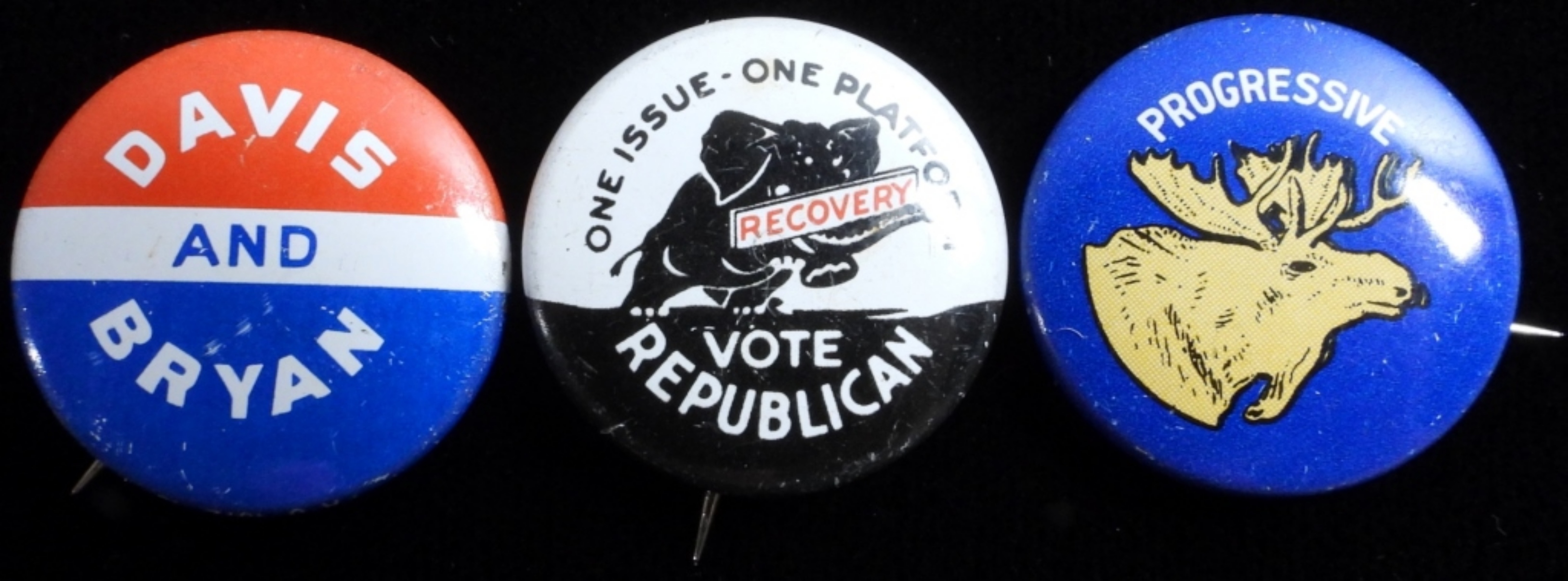 1) WOTM Women Of The Moose Pin 2) One Issue-One Platform Vote Republican Recovery Pin 3)Davis and Bryan Pin
