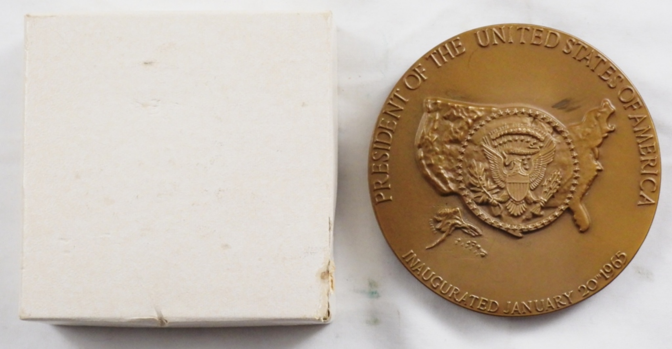 Inaugural medal commemorating the inauguration of Lyndon Baines Johnson as the 36th president of the united states of america. January 20th 1965.good condition, half of a box. No top half