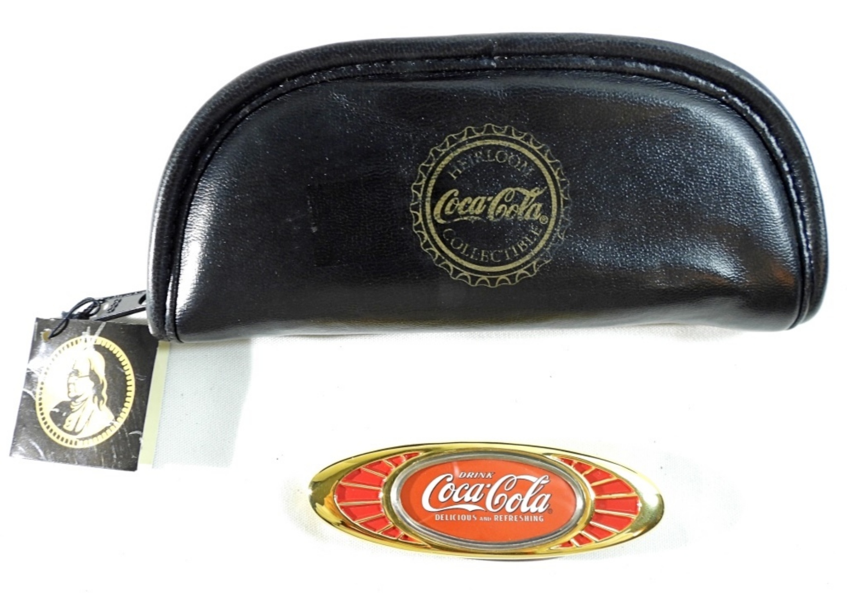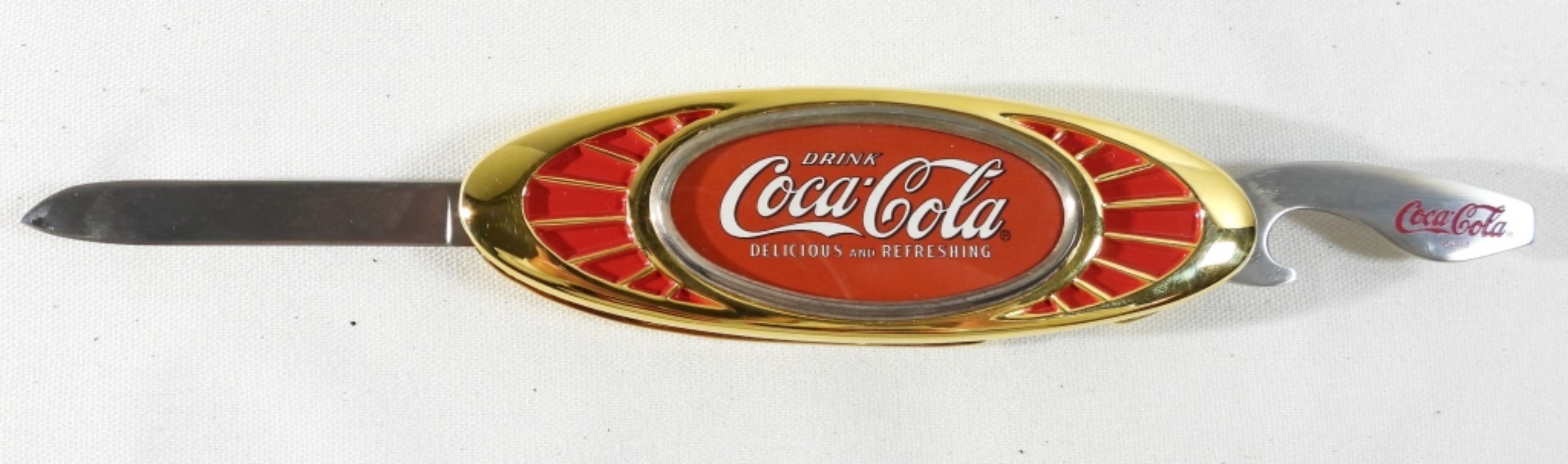 Gold and red Coca-Cola knife and bottle opener, In original zip case