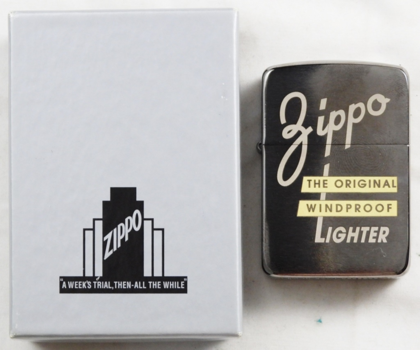 In its original box. “Zippo The Original Windproof Lighter” 1941 replica. Made in 2014