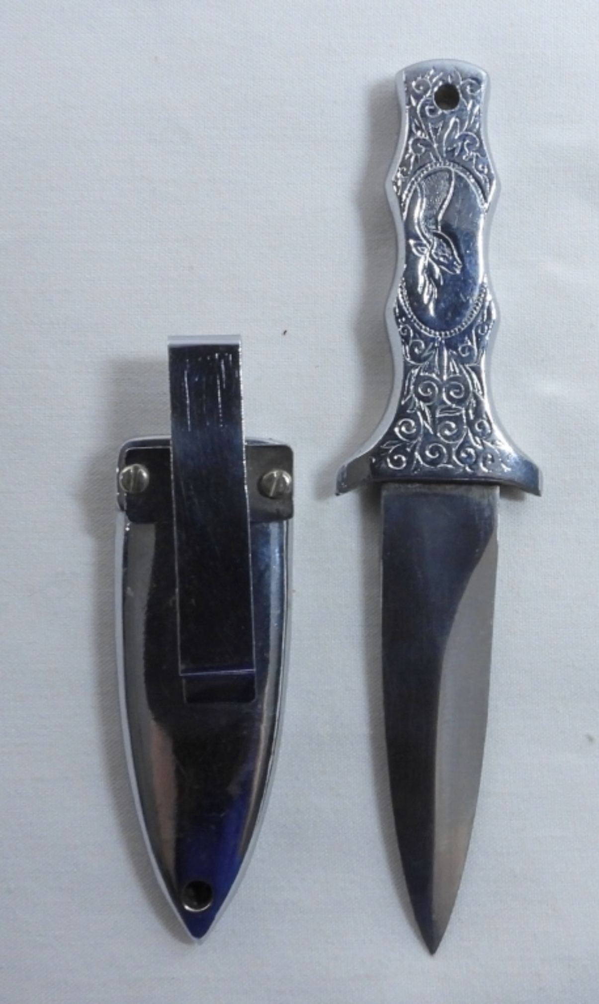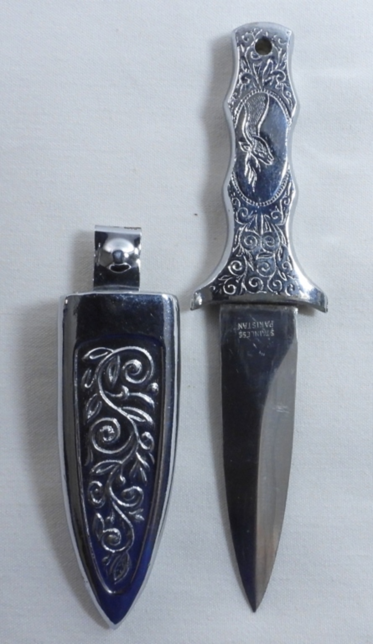 Silver-tone and ornate design featuring a deer on the handle, the sheath has a clip, the dagger is 6 1/2″ total length, Pakistan