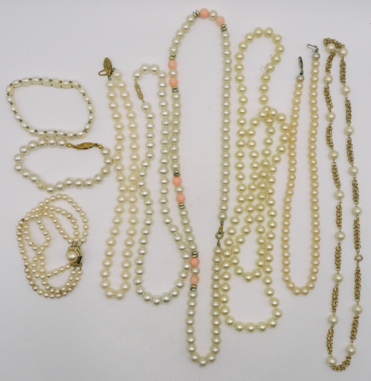 Faux pearl necklace and bracelets, beautiful with a few pink beads
