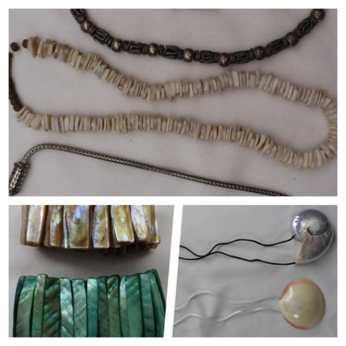 2 large shell necklaces, 3 short necklaces, and 2 stretch shell bracelets