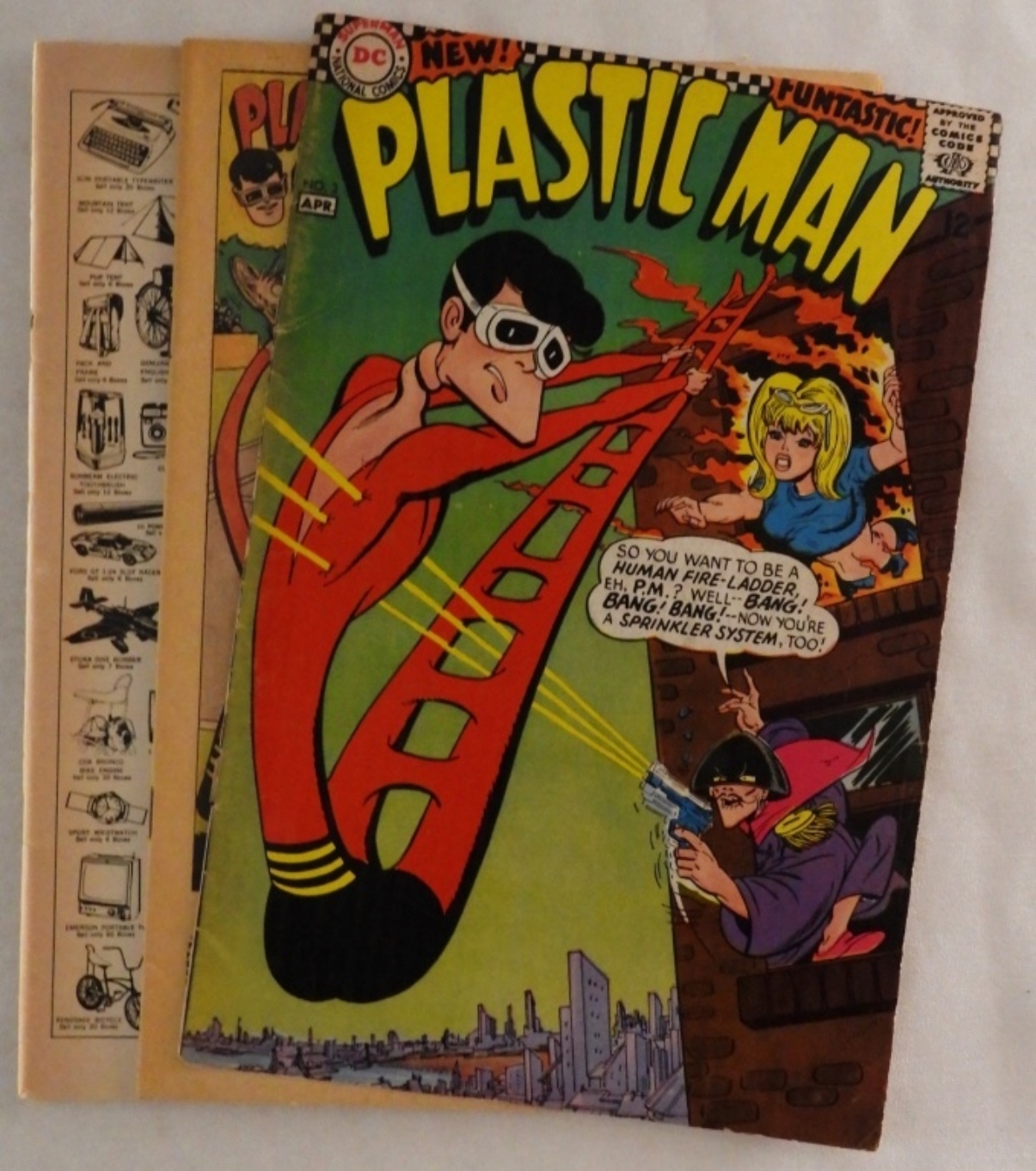 Silver Age, DC Comics, Plastic Man, #2, 3, 8, and 10, #2 the cover is halfway detached and partially torn, #3 the cover is detached and in two pieces, 8 and 10 g-vg