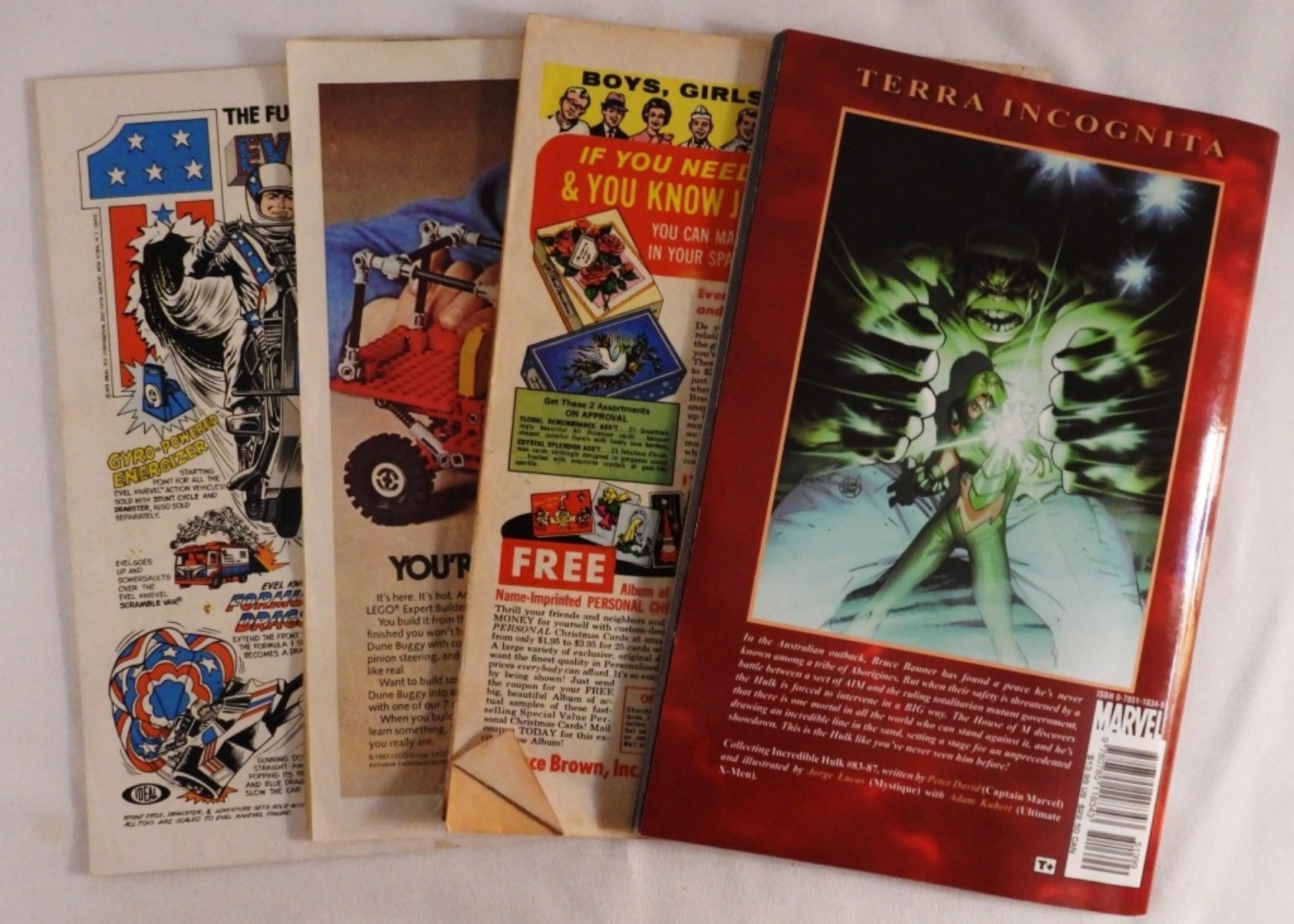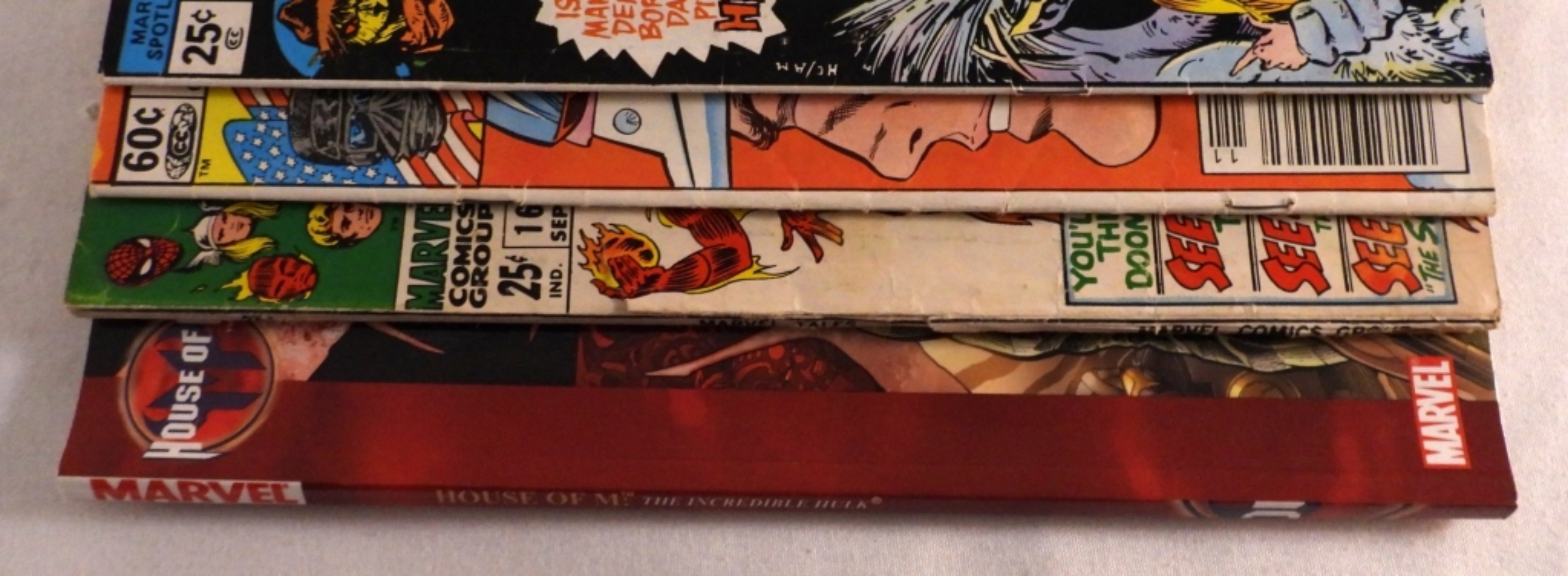 1) House Of M The Incredible Hulk. 2) The Scarecrow #26 3) Team America #6 4) Marvel Tales #16 ( The cover is ripped along the spine.)
