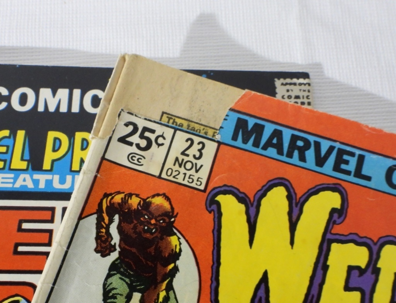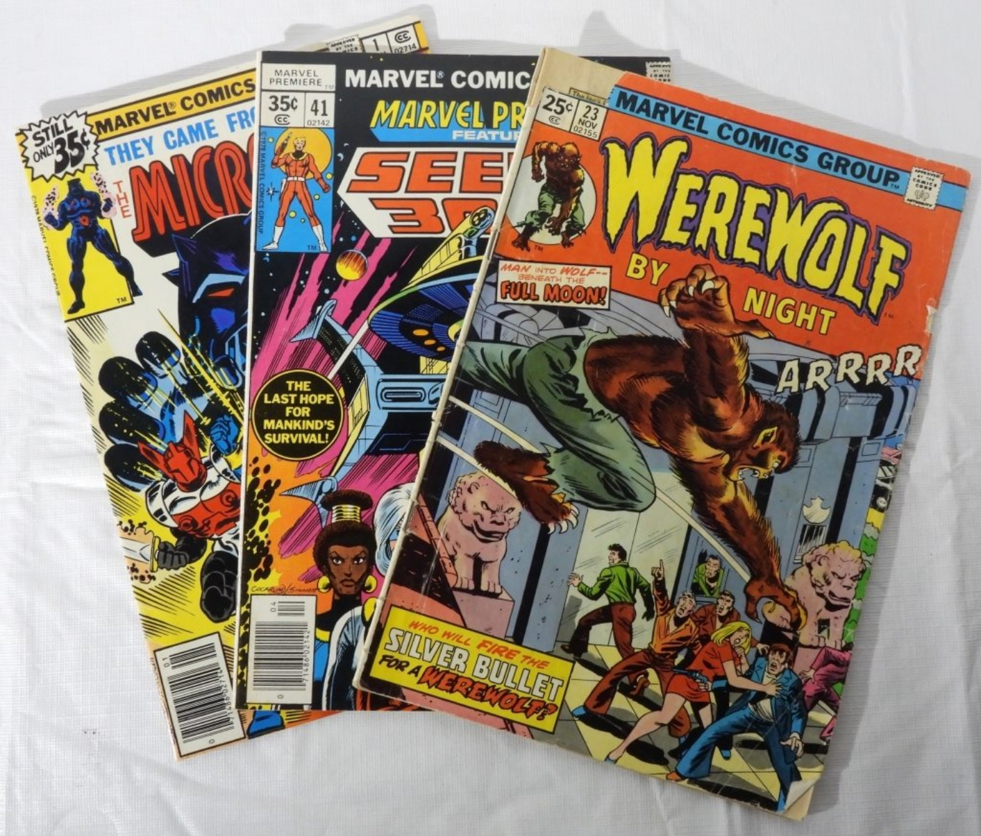 1) The Micronauts, number 1. 2) Werewolf By Night, number 23 ( There is a bit of the cover missing at the top) 3) Marvel Premiere Seeker 3000!, number 41.