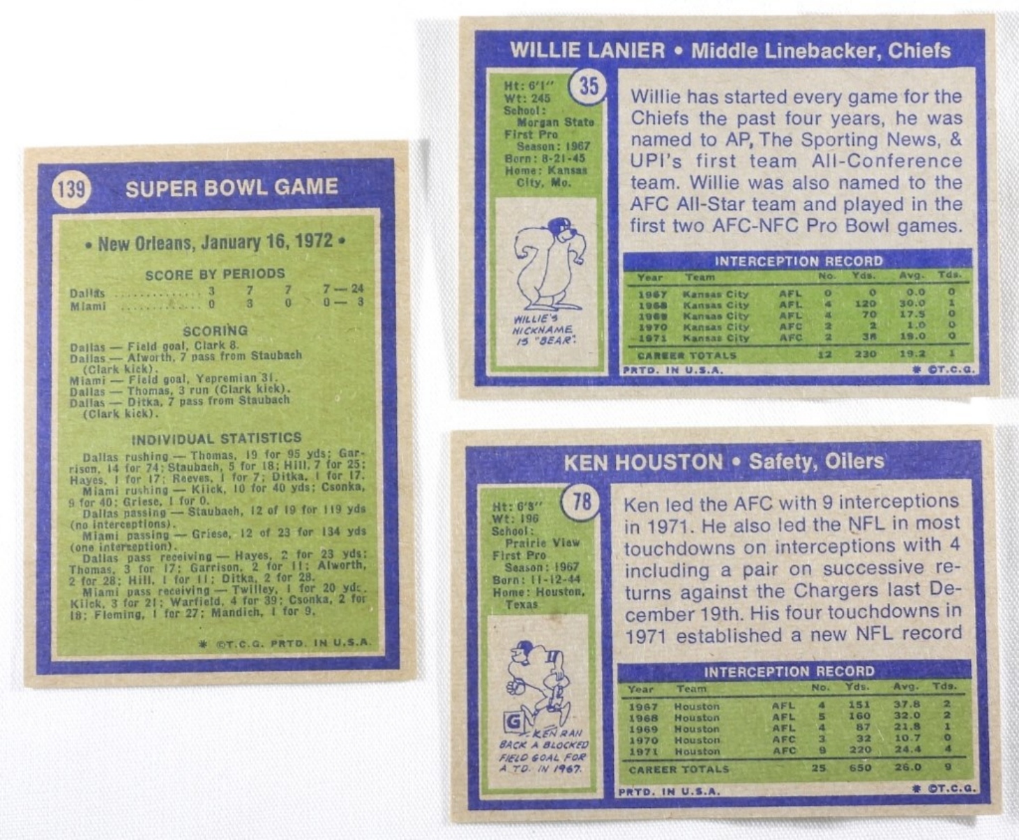 Willie Lanier, Ken Houston, and Super Bowl game cards in this lot. All in good condition